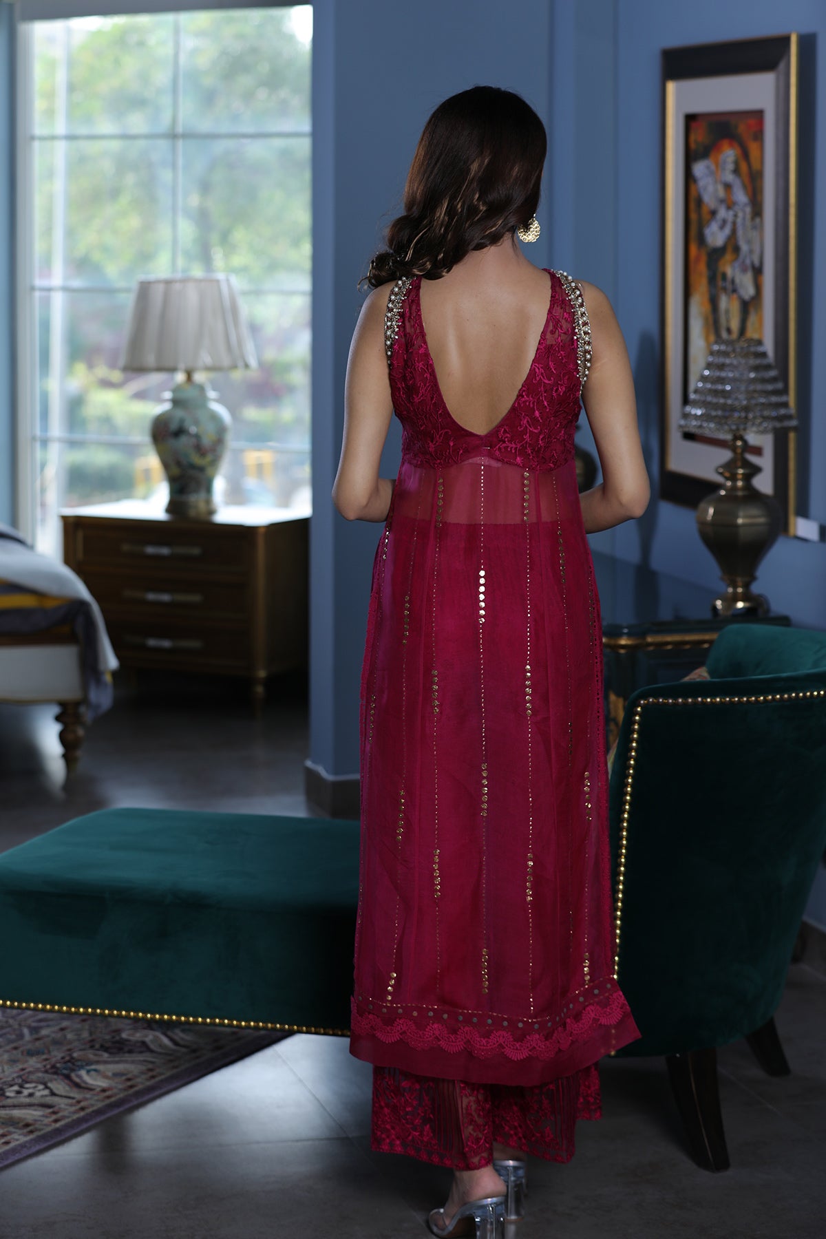 Fuscia side slit modern cut gown with hand embellishments on neckline. Paired with embossed silk culotess.