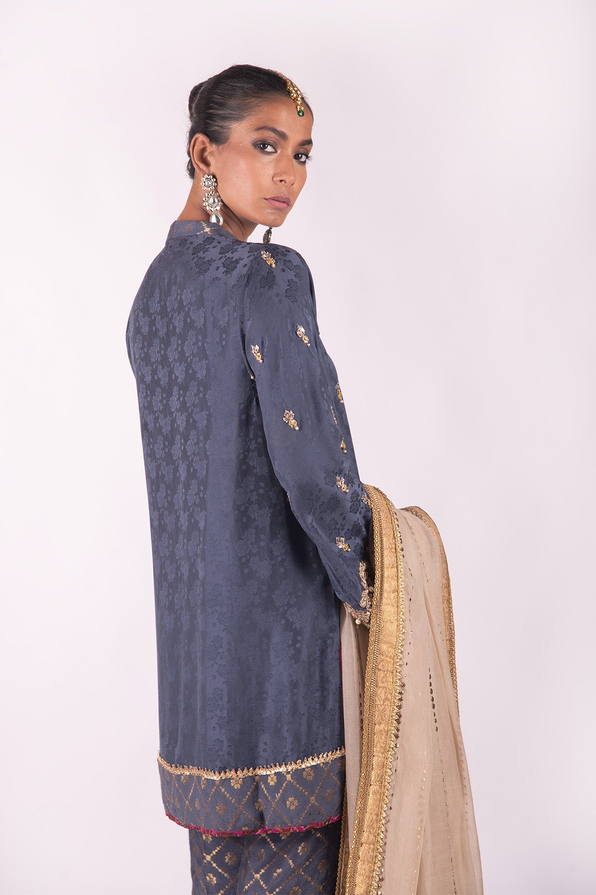 Silk shirt with cotton net baorders embelihsed with gota pearls and dabka. Paired with cotton net azar pants with gota finishes.