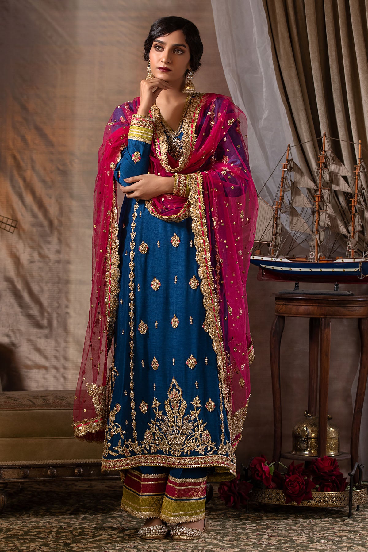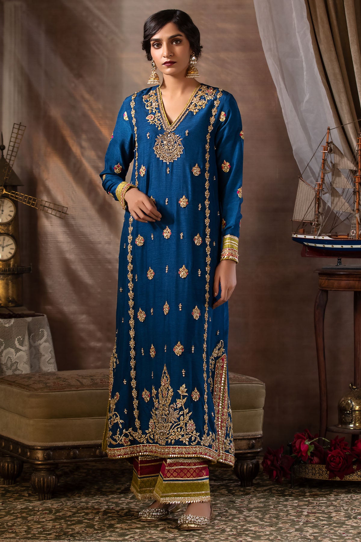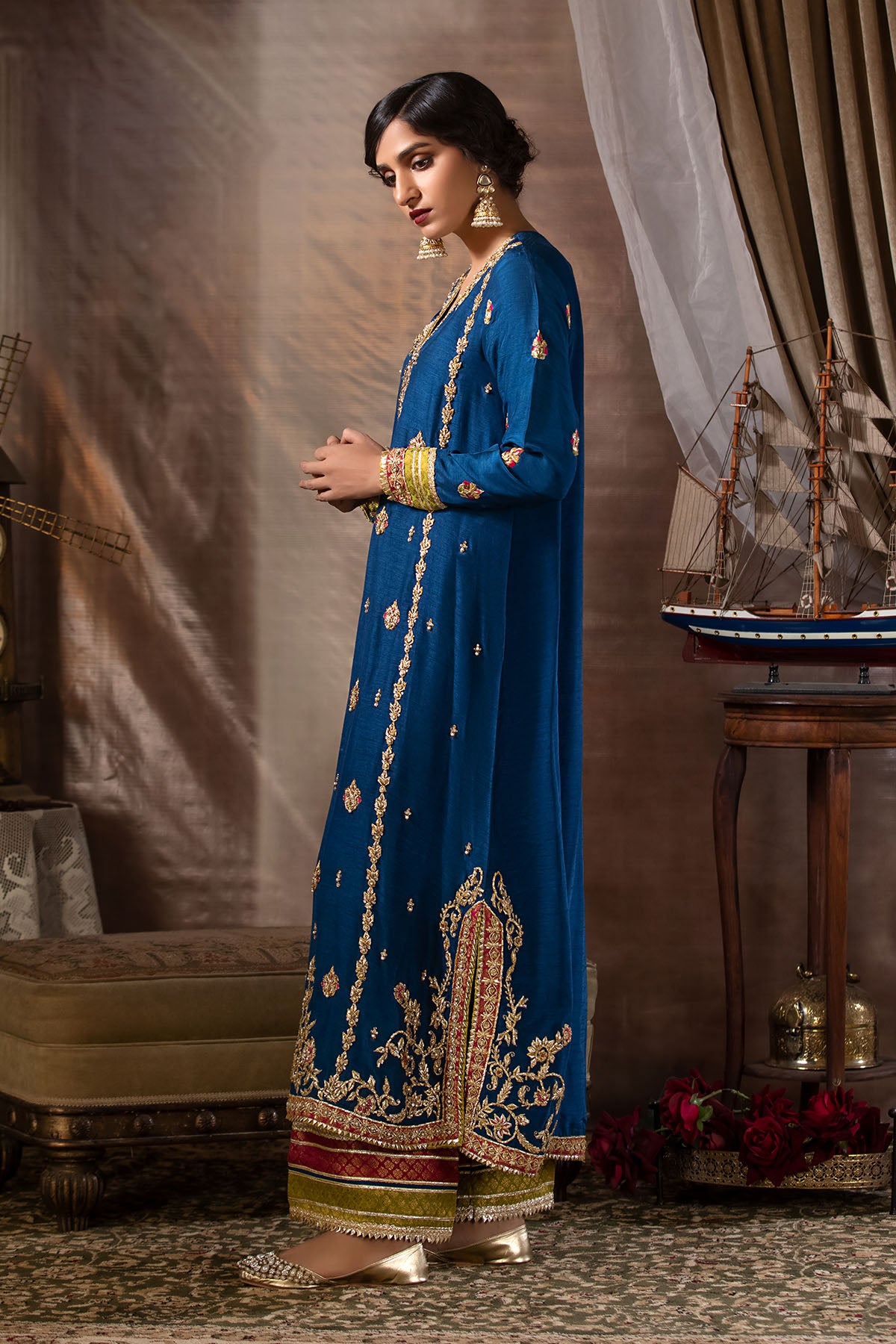 Introducing our exquisite solid blue paneled A-line shirt, a masterpiece crafted from the finest korean raw silk material. Adorning the neckline and panel lines, you'll find intricate gota work and dazzling embellishments, adding a touch of opulence and charm to the outfit. Paired with straight pants with gota and jamawar finishes.