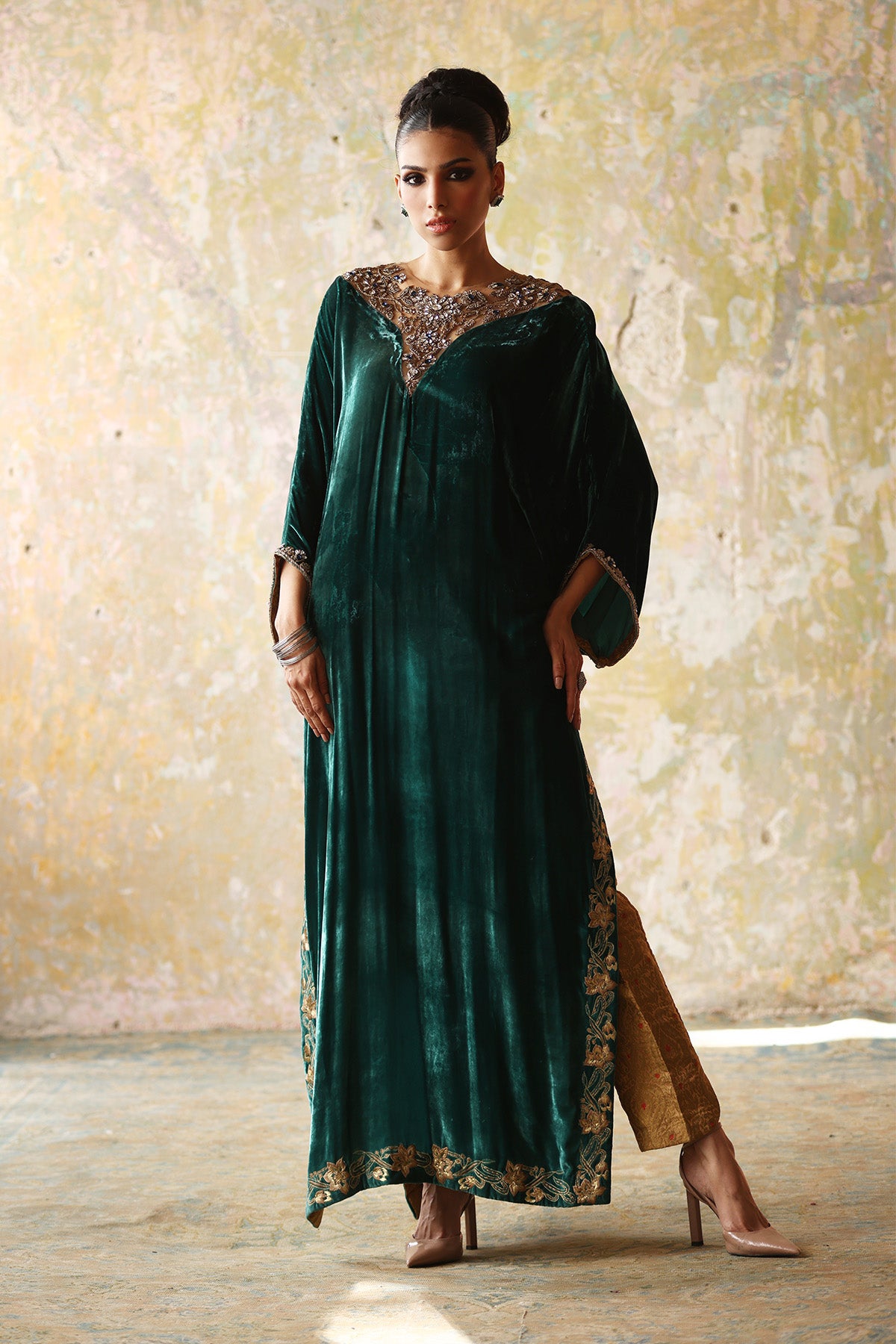 Green velvet kaftan accentuated with an embellished neckline featuring zardozi and crystal work. Paired with jamawar trousers in gold and accents of red.