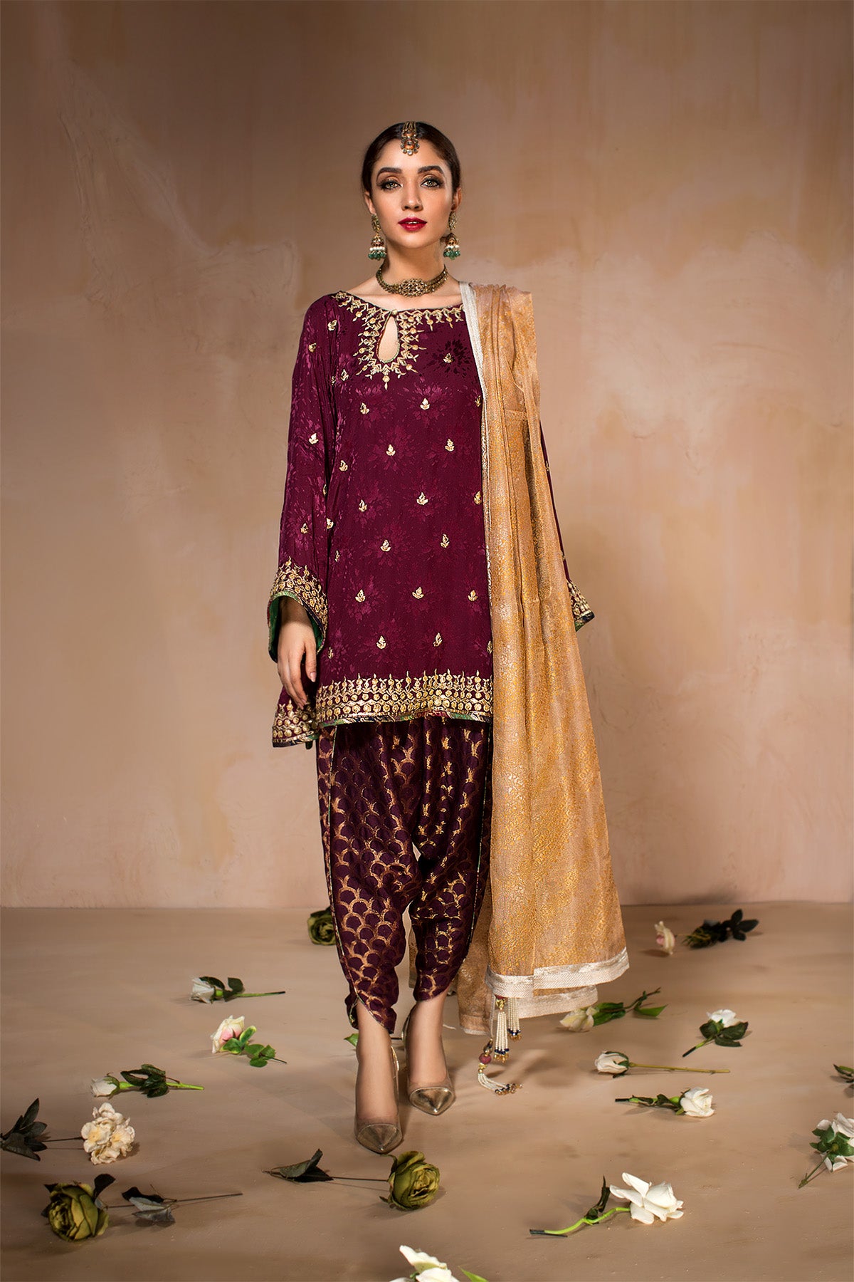 Embossed silk shirt with gota work and chatta patti edgings. Cotton net tulip shalwar.