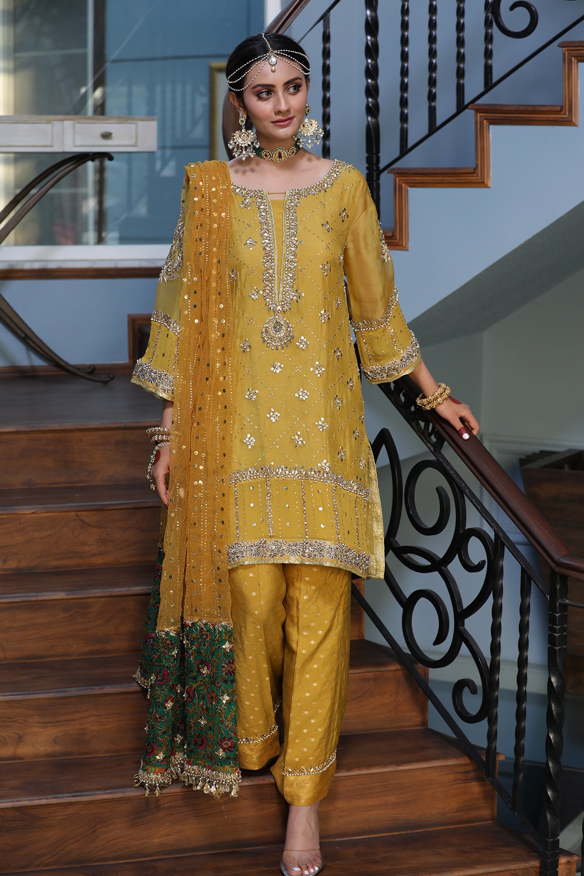 Vibrant mustard organza mukesh shirt gracefully embellished on the neckline in contrasting gold hues, the outfit is further enhanced by geometeric mukesh patterns with fully embelished sleeves. Paired with cotton net pants with hand embellished borders. Note: Duppata Price is not included