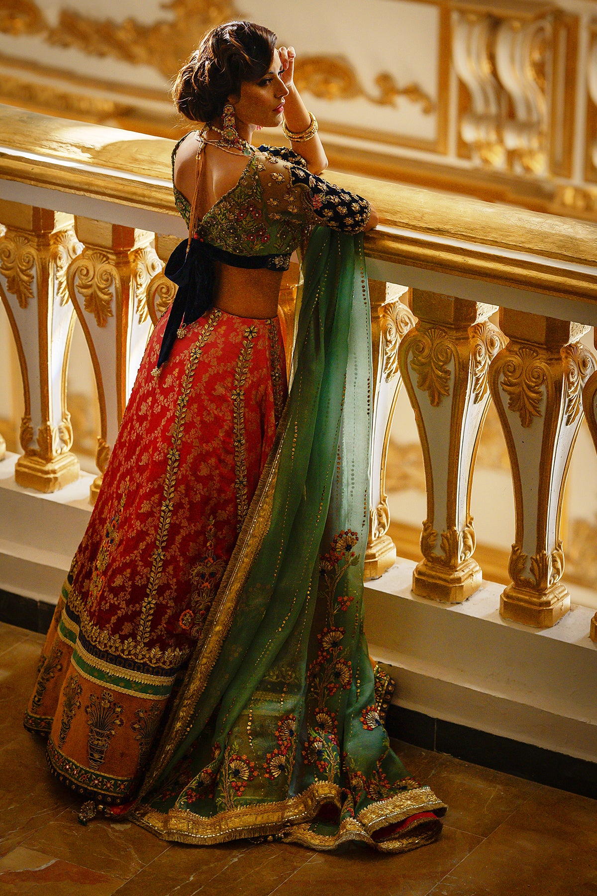 Mint green organza blouse with contrast velvet appliques, hand embellished with zardozi, pearls and crystals and featuring multi color thread embroidery. Paired with a pale red ombre chiffon jamawar lehnga with canary yellow hand block printed borders; featuring multi color thread embroidery, pearls and gotta work. Combined with a mint green organza dupata accentuated with mukesh, multi color thread embroidery and gotta work.