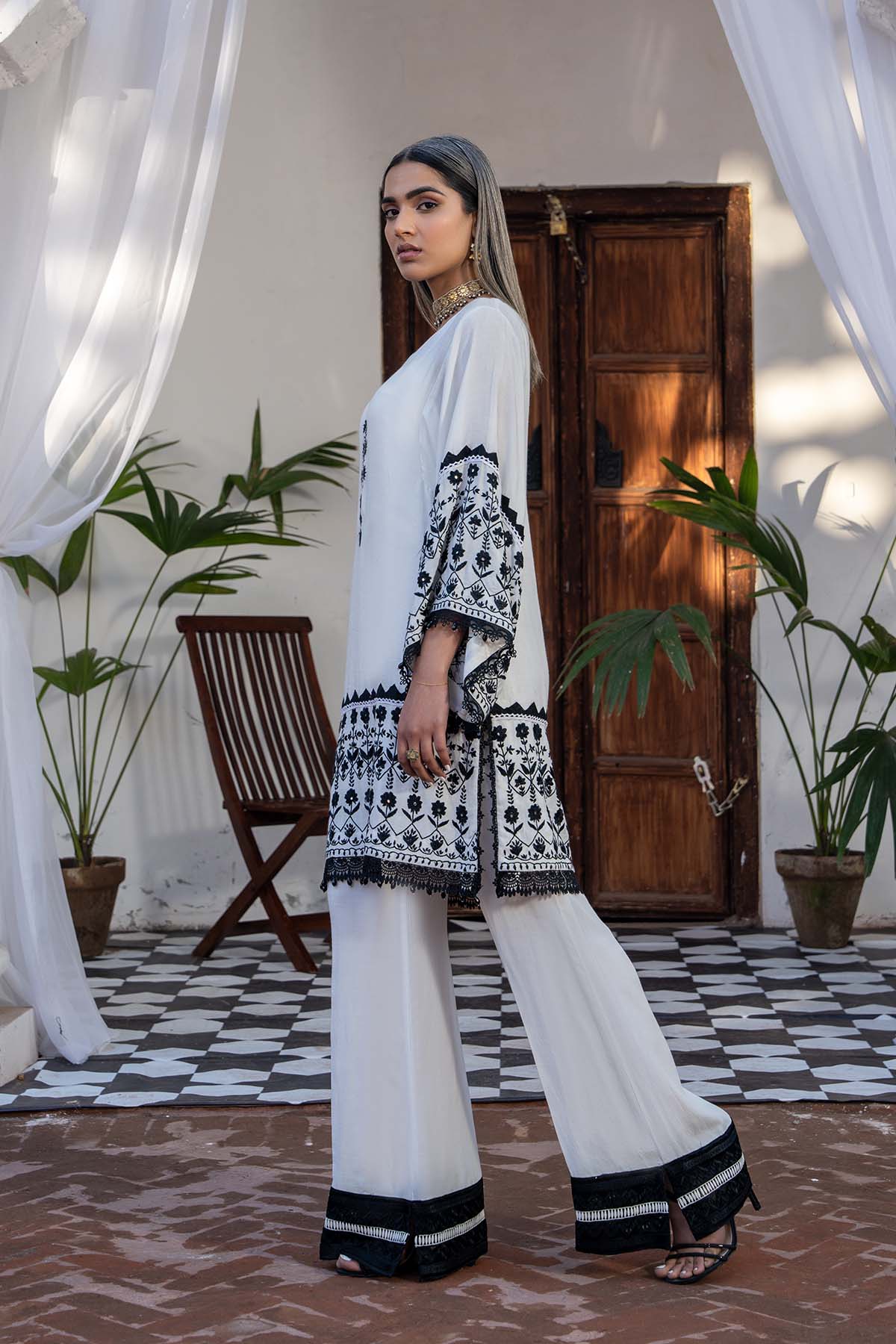 Bold contrasts, timeless grace: Step into sophistication with this short black and white cotton net kameez, featuring wide kaftaan sleeves intricately adorned with black kasheedakari, ralli appliqué, and mesmerizing mirror work. Paired effortlessly with silk pants.