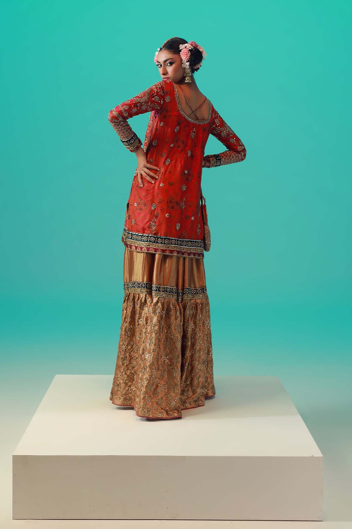 Paired with a pure gold tissue gharara, the ensemble showcases a heavy ari worked jaal adorned with tilla and sequins, finished with fuchsia purple jamavar. The two-tone tissue net dupatta, with matching hand embellishments, and a crushed block-printed dupatta with gotta finishing in purple and teal, add a vibrant and contemporary touch.