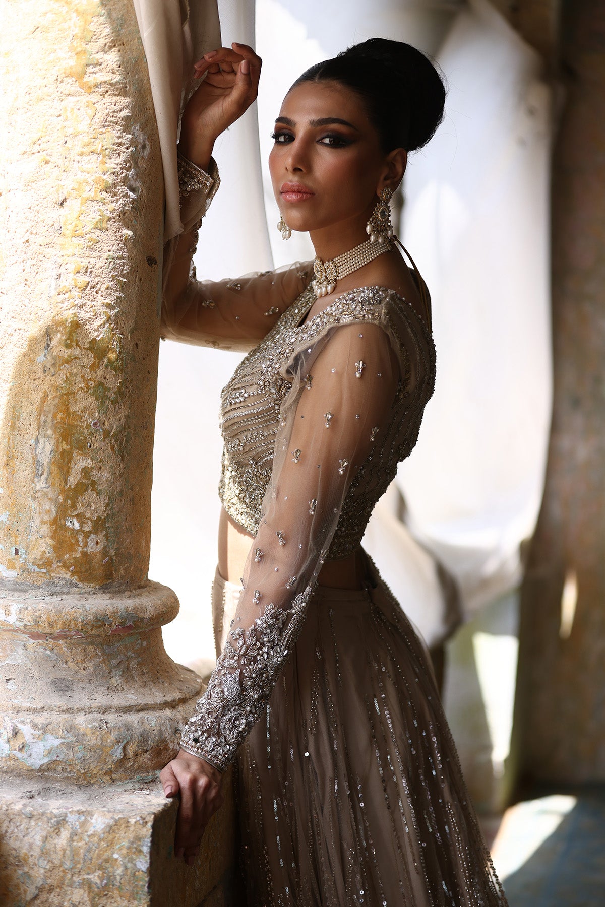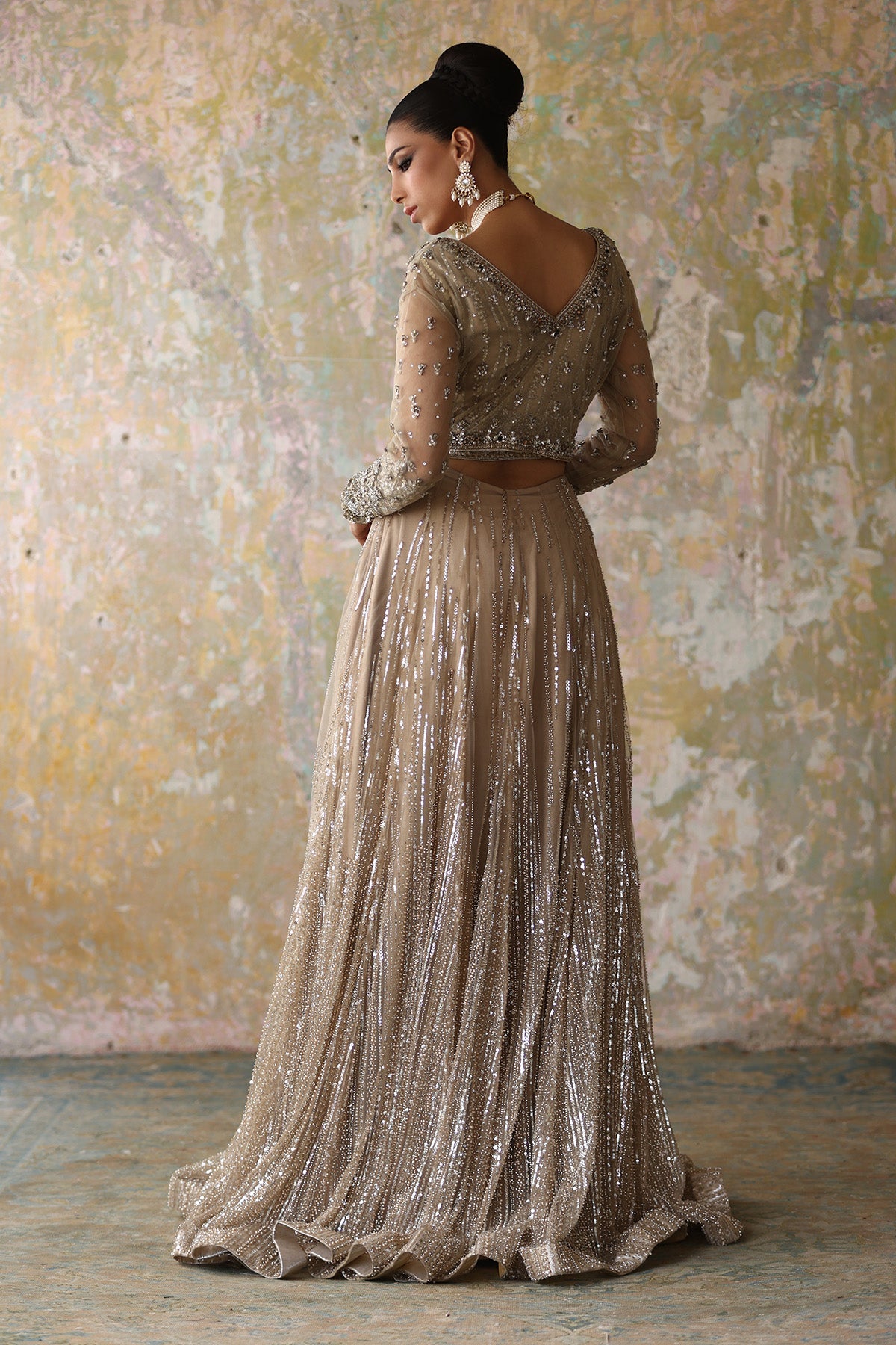 Dripping in Elegance: This fawn golden silk base blouse, intricately adorned with gold and silver dabka, pearls, and crystals, is a timeless masterpiece. Paired with a matching jacket featuring similar embellishments and a dazzling gold net lehnga, it's a symphony of sparkle and grace that's sure to make you shine like a star.