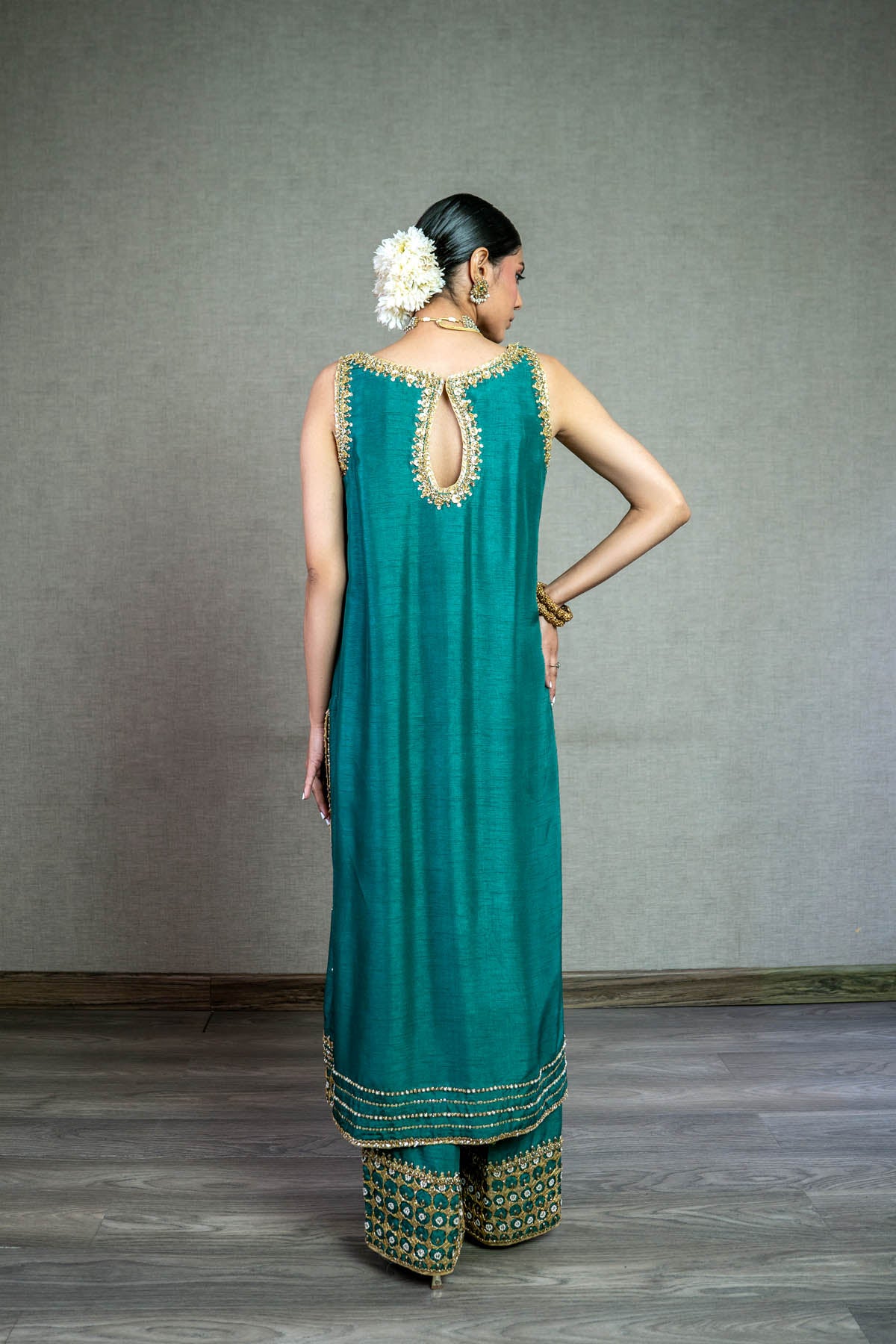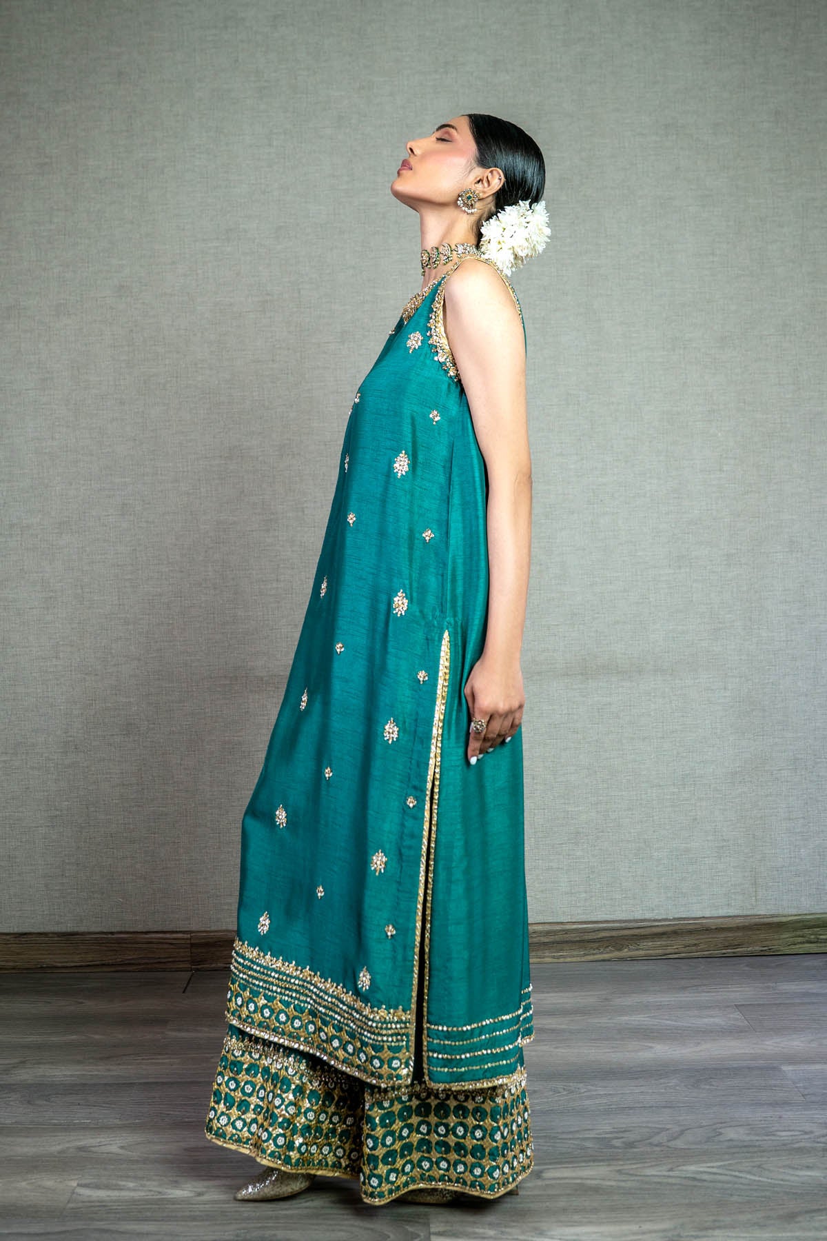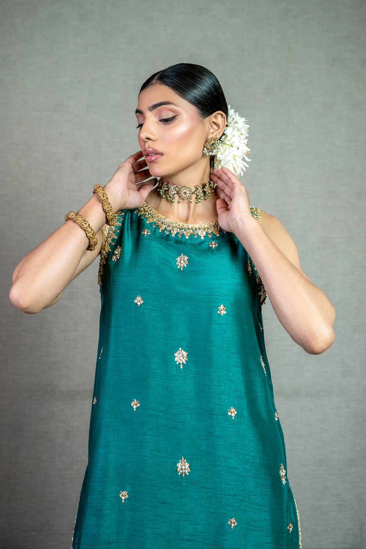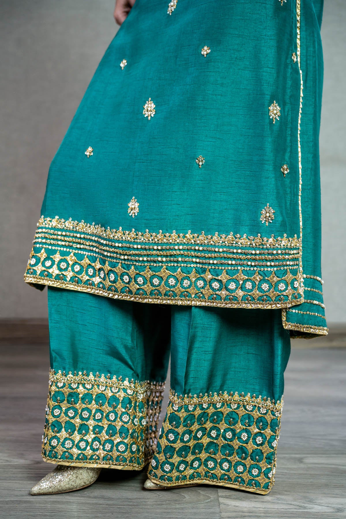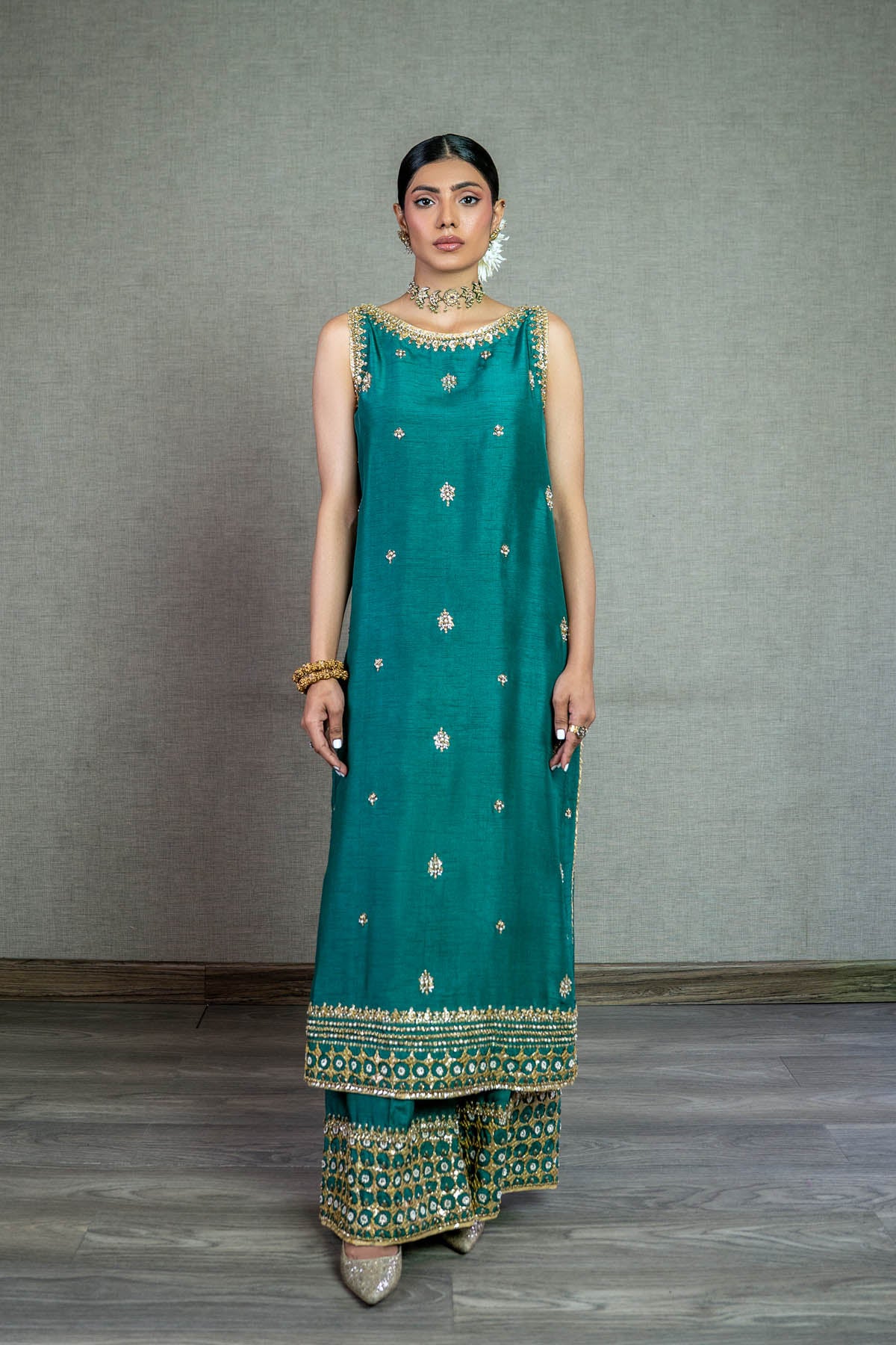 Radiate in this vibrant long em. green raw silk shirt, bedecked with exquisite Gota, Dabka, and Naqshi work. The symmetrically spaced floral spray adds a touch of grace and symmetry. Paired with matching raw silk pants. NOTE: Duppata price is not included. Dupatta code is NBC-D-08-Golden dupatta Price 37,000/-