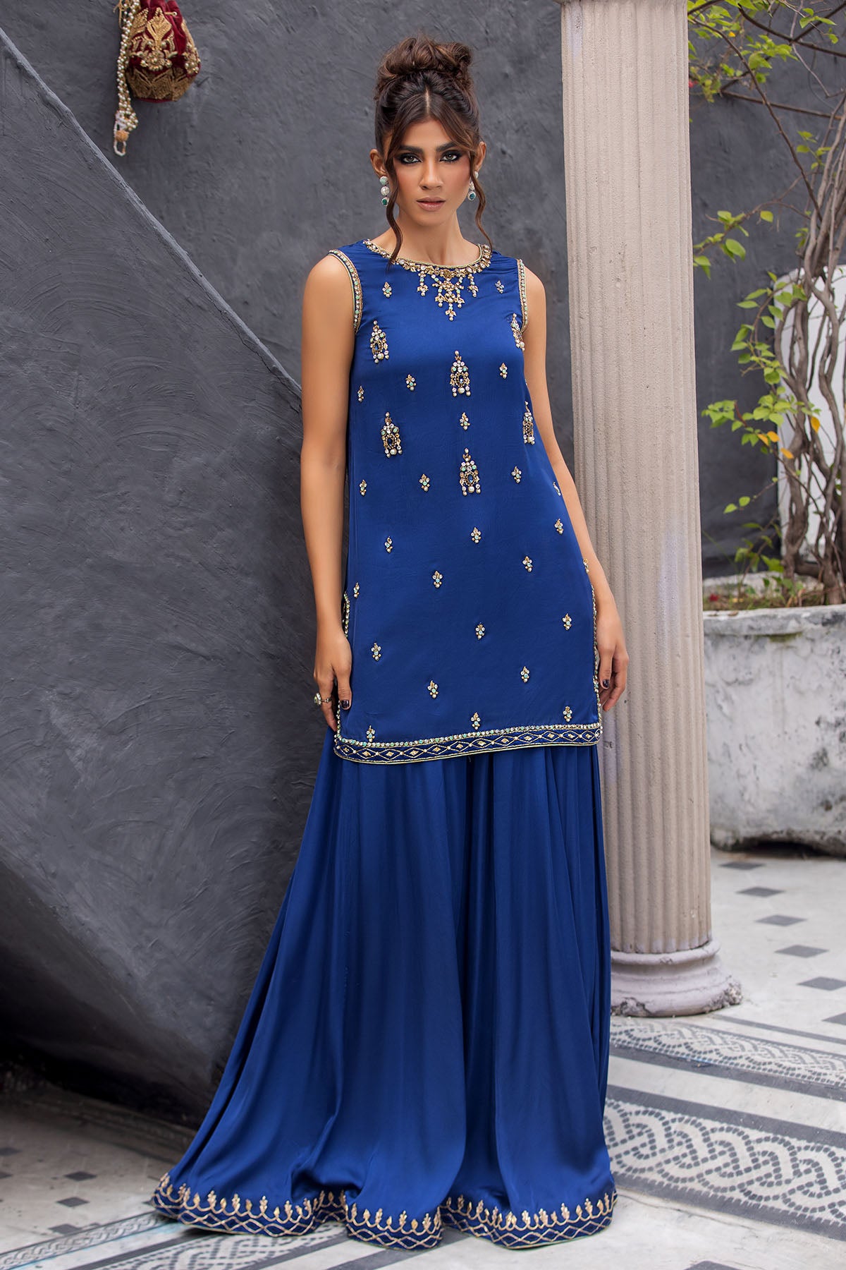 Effortless glamour meets intricate artistry in this sleeveless masterpiece adorned with shimmering zari, delicate pearls, and dazzling stones. The fusion of exquisite gota work elevates the elegance, harmonizing flawlessly with the flowing allure of the sharara pants. Note: Shawl price is not included.