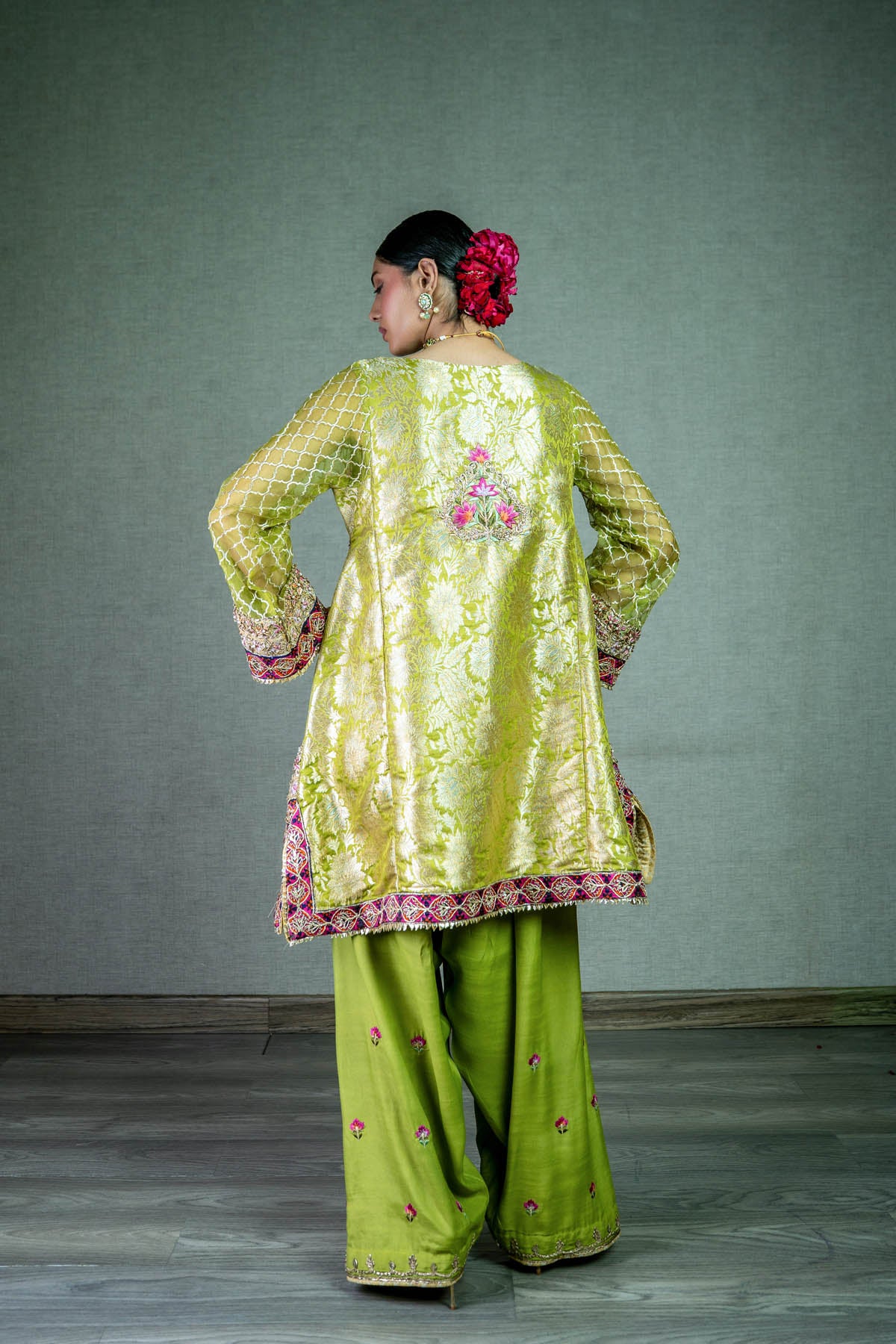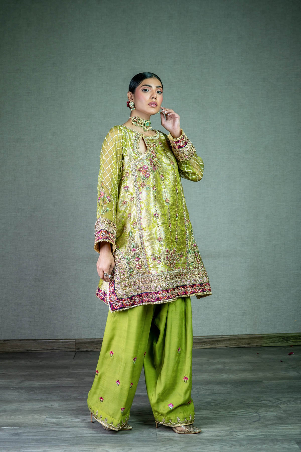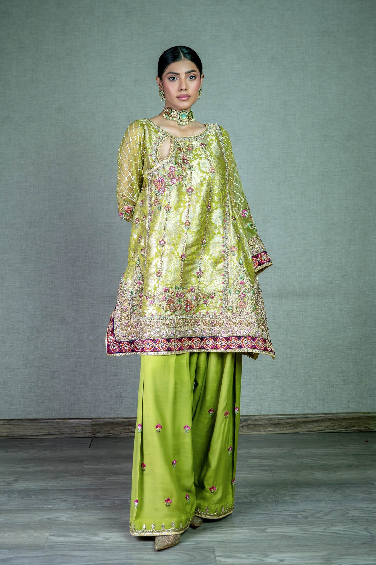 Embrace timeless charm in this lime green jamawar short kurta, where intricate gota and resham thread work intertwine with grace. Adorned with captivating block printed borders and crowned with gold kingree, it's paired effortlessly with wide-legged shalwar.