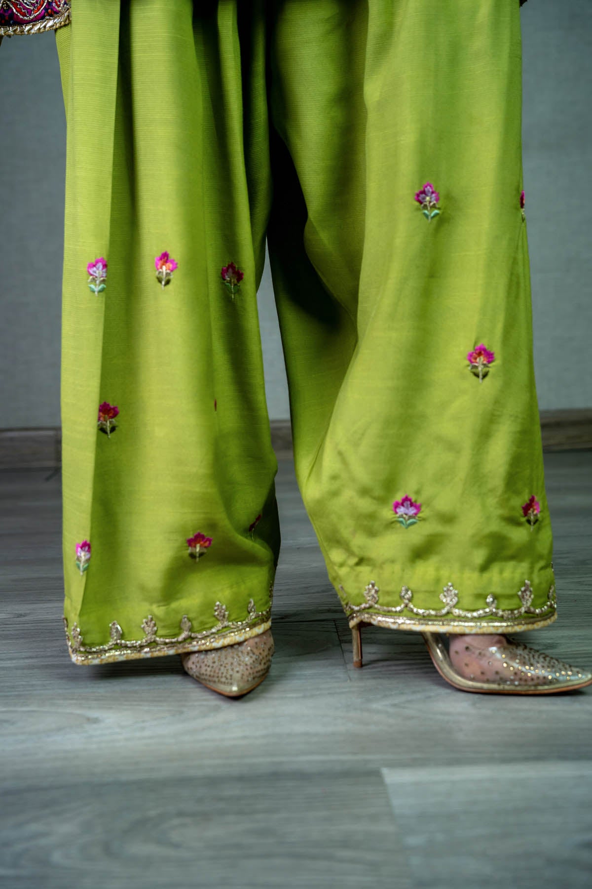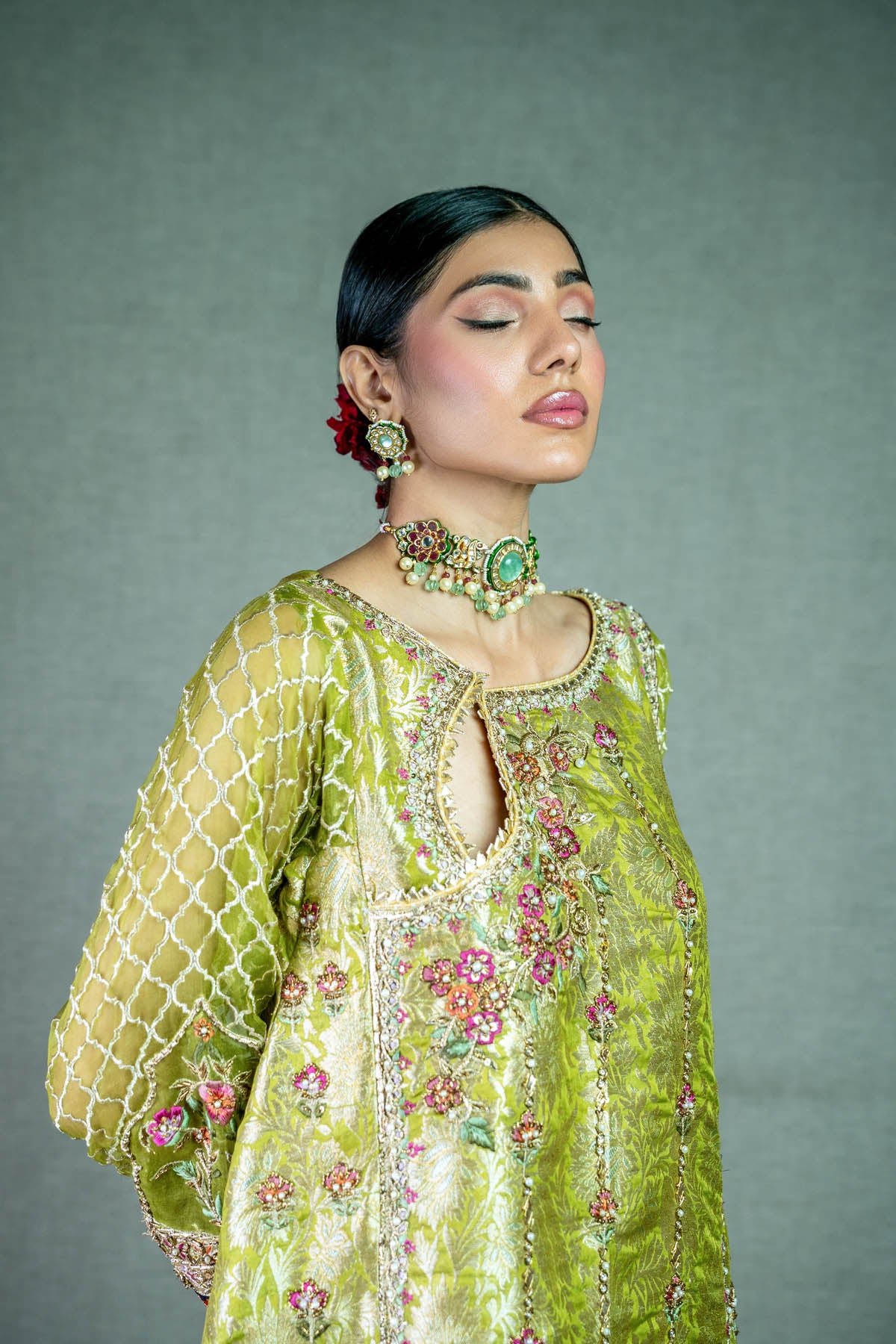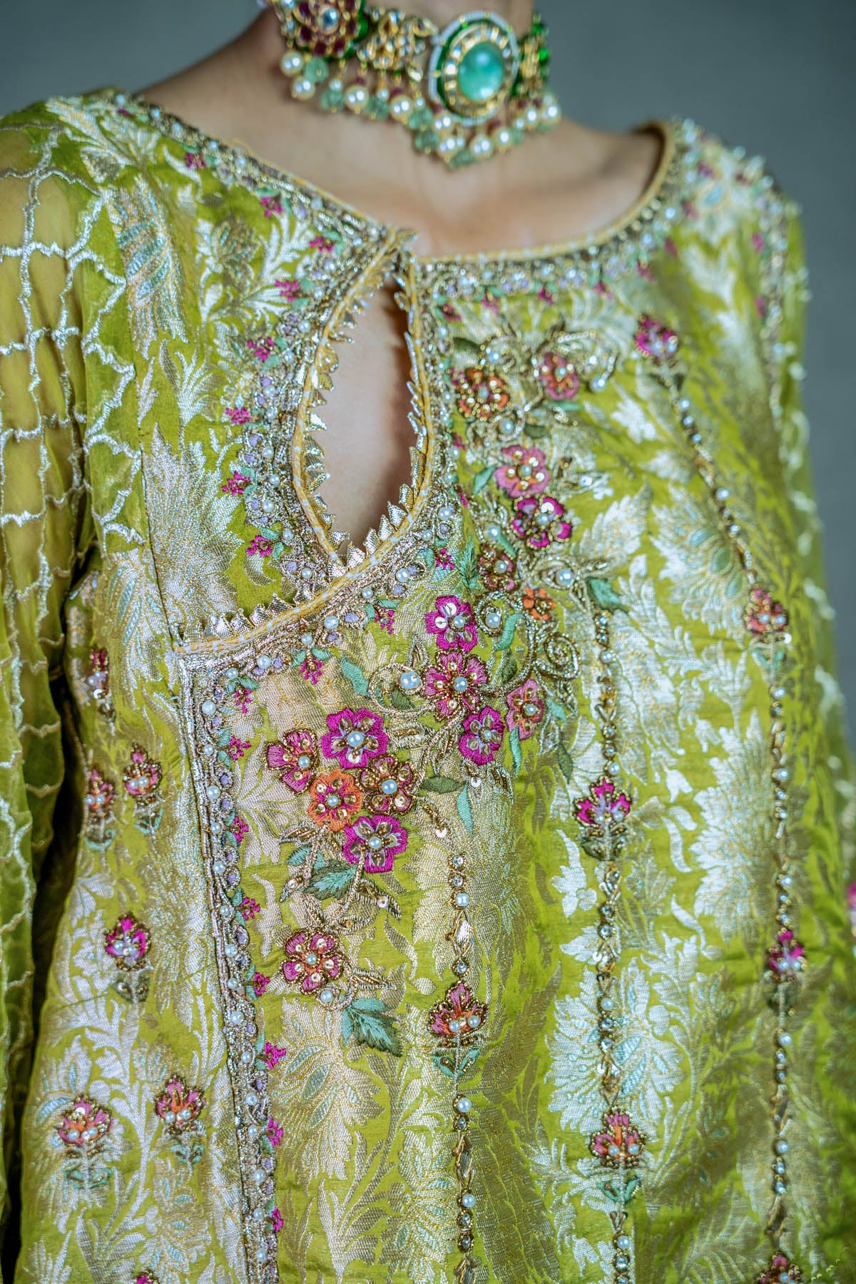 Embrace timeless charm in this lime green jamawar short kurta, where intricate gota and resham thread work intertwine with grace. Adorned with captivating block printed borders and crowned with gold kingree, it's paired effortlessly with wide-legged shalwar.