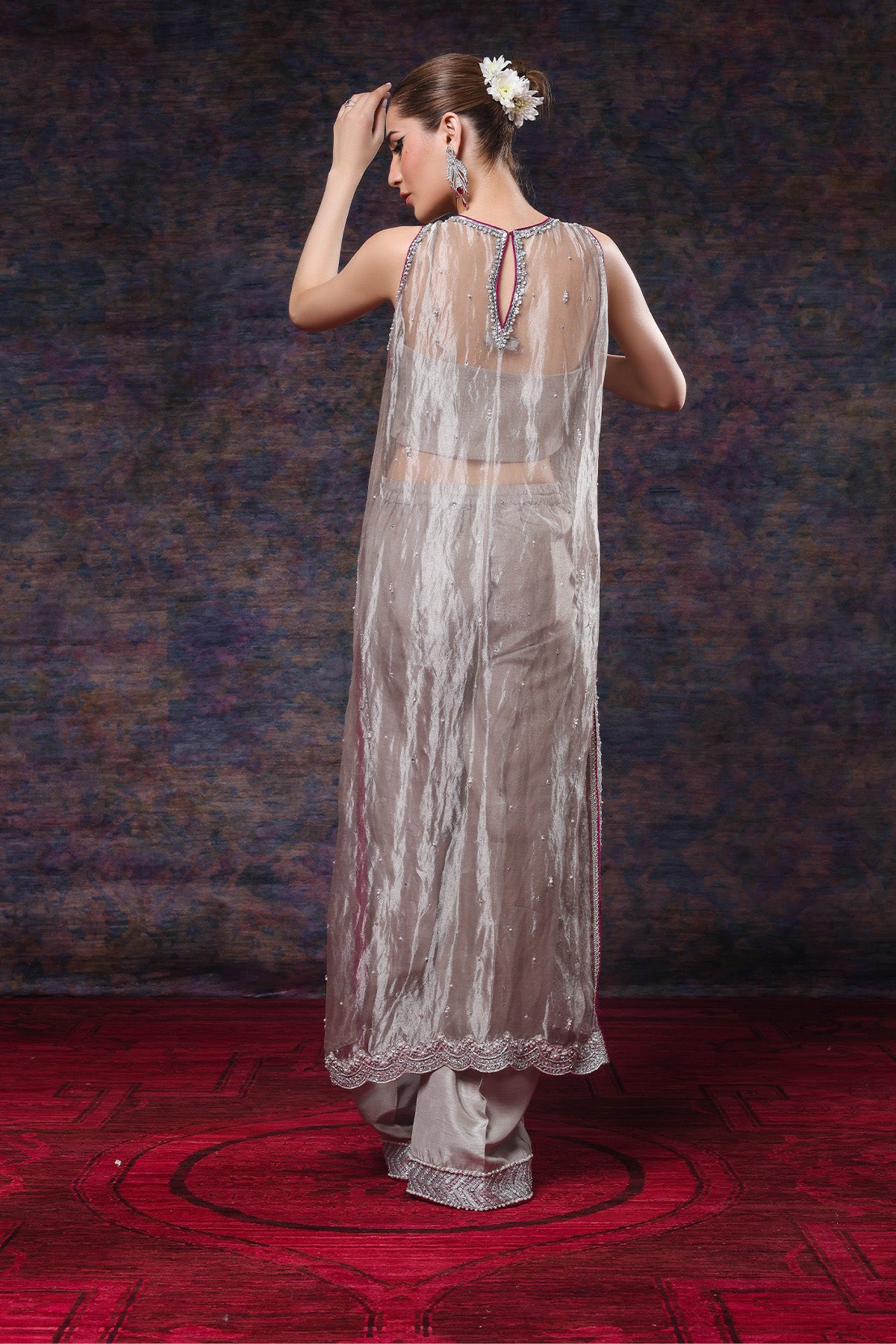 The essence of silver elegance in this tissue long shirt. Hand Mukesh buttons add a touch of luxury, while intricate silver Dabka, crystals, stones, and pearls create a dazzling ensemble. Paired with a raw silk blouse and pants featuring a hand-embellished borders