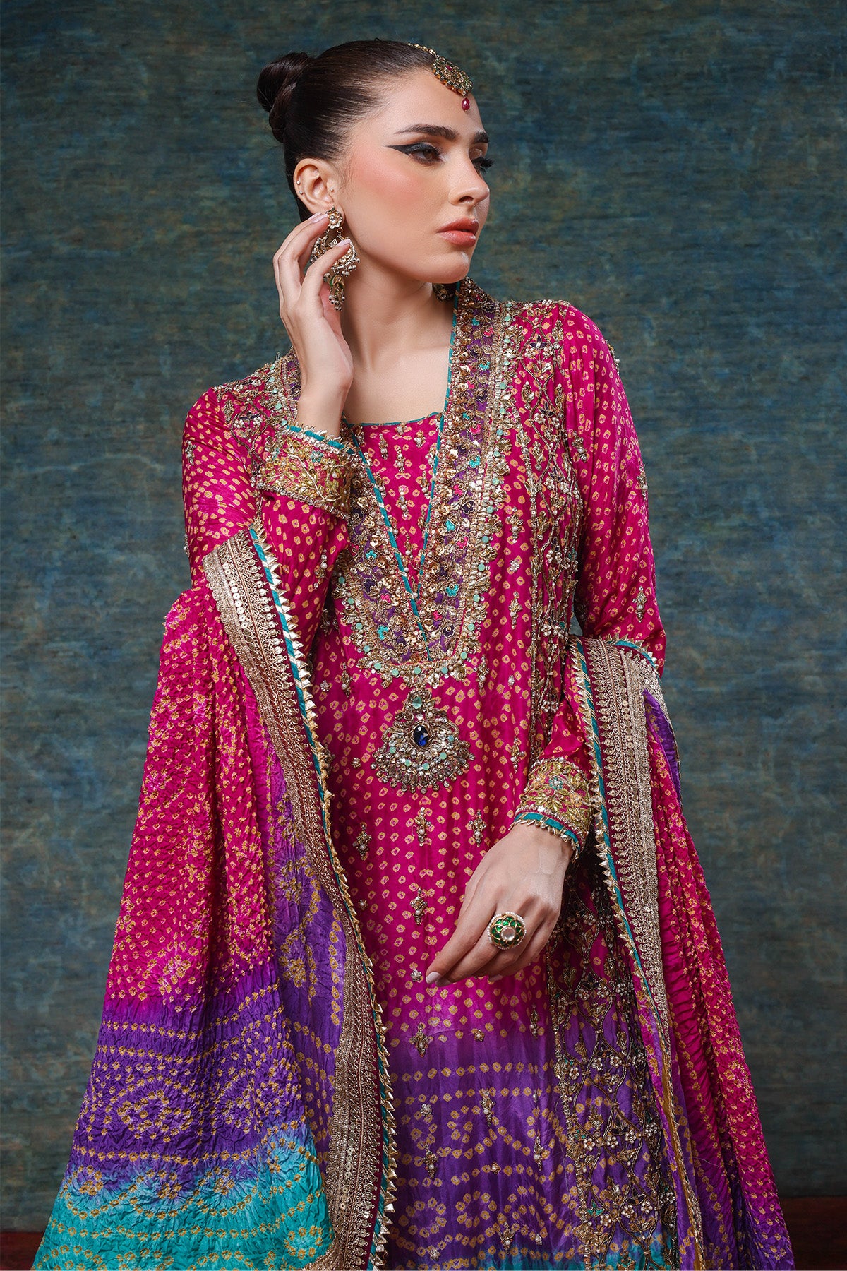 Elegance meets tradition in this three-toned Chunri shirt, adorned with intricate Gota Naqshi and pearls, showcasing captivating geometrical patterns and Jamawar detailing along the hem. Paired with raw silk pants, and finished with a regal kingri touch. A symphony of artistry and style. Chunri base beautifully coloured duppata.