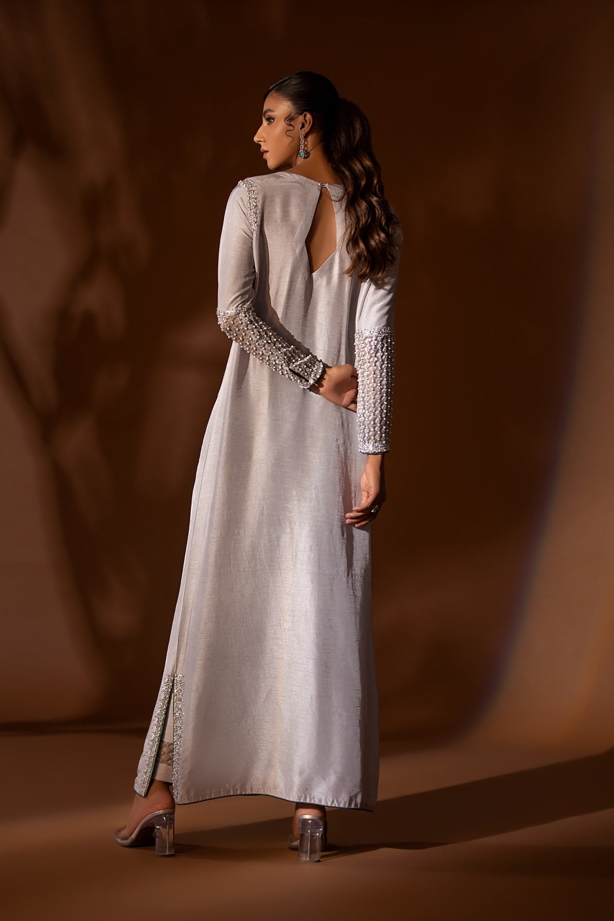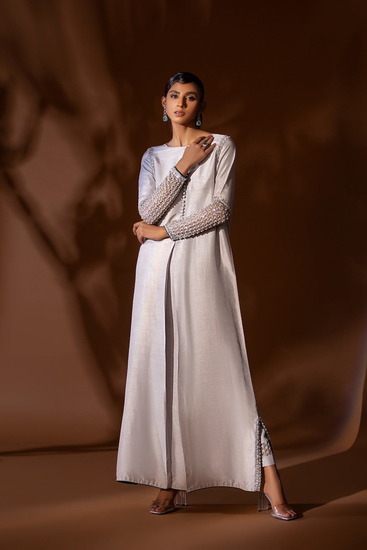 A long lilac grey shirt with short side slits with silver dabka, gota and crystal details on the arm hole and sleeves featuring box pleats. Paired with grey silver pants with embroidered organza insert.