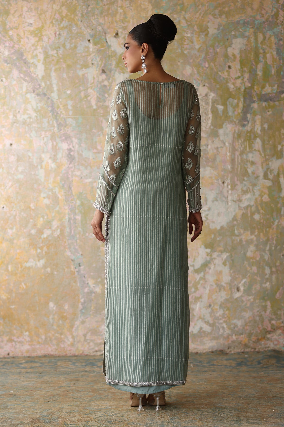 A long Sea green thread embroidered shirt with intricate embellishments on neckline and sleeves. Paired with embossed silk plain pants.