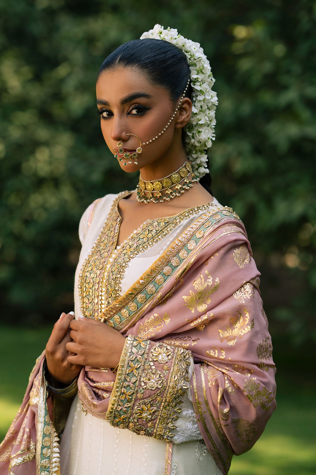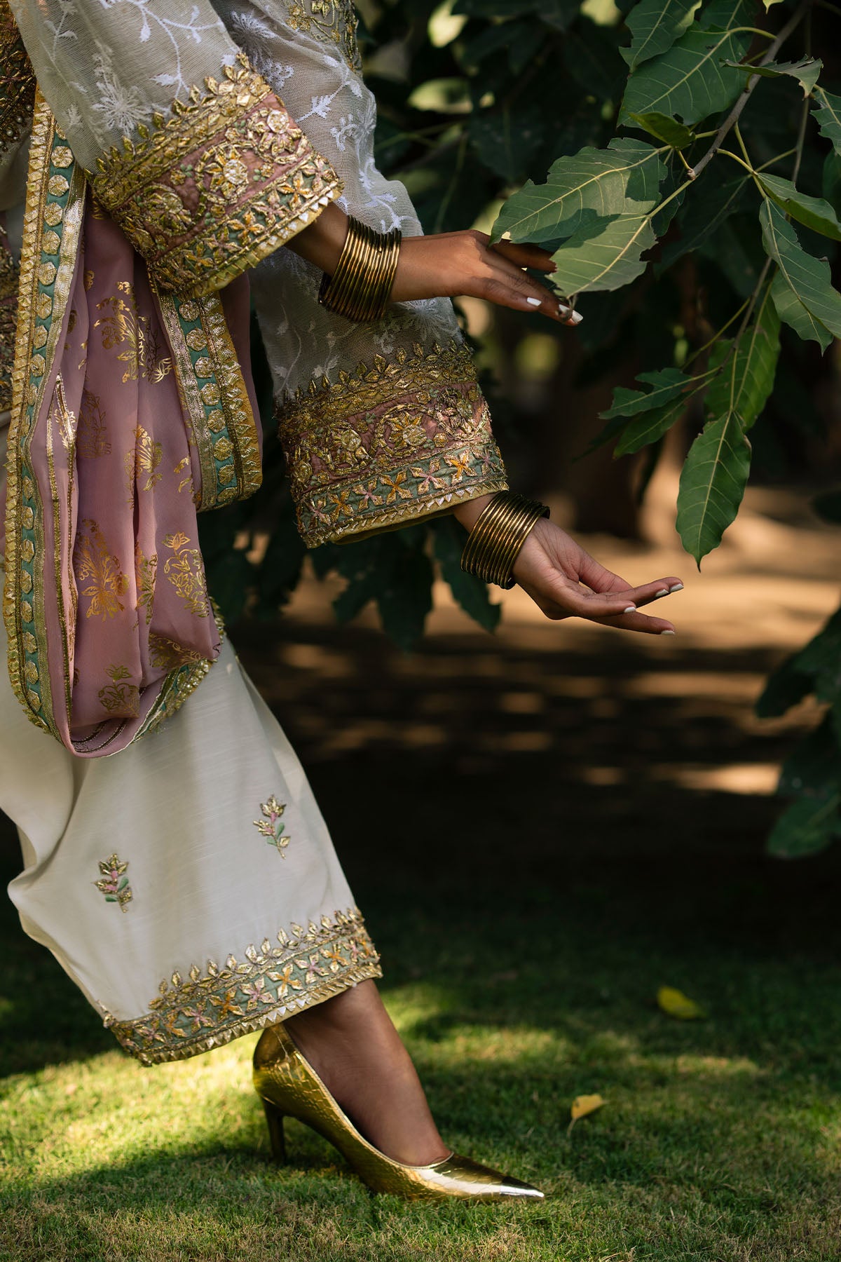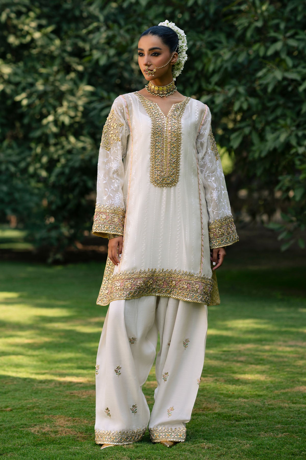 This short khadi cotton net shirt paired with silk shalwar is an embodiment of timeless elegance. The white resham embroidery on the fabric creates a soft, delicate texture, while contrasting colored borders along the neckline, hem, and sleeves bring a pop of vibrancy. Intricate colored resham and gota embroidered motifs add depth. NOTE: Duppata price is not included.