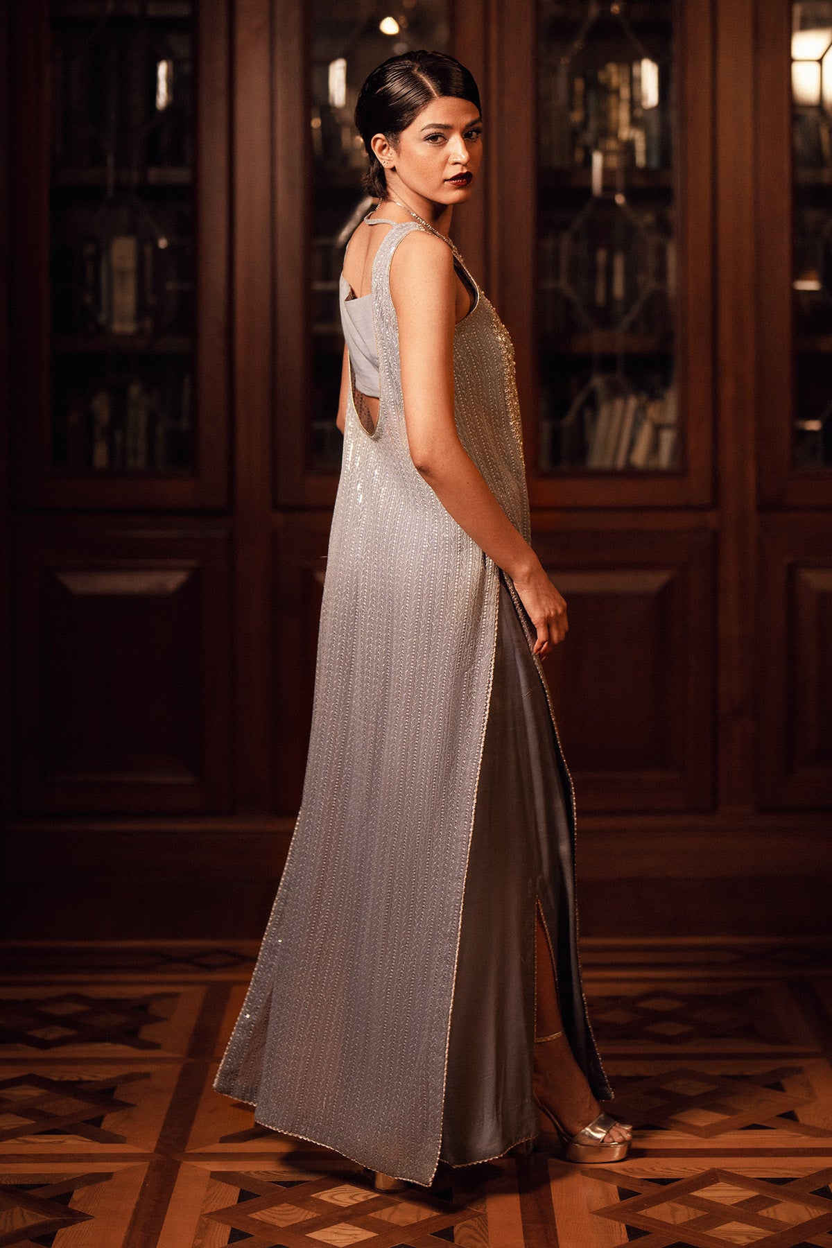 Sleeveless long chiffon shirt, gracefully transitioning in light grey blue hues and adorned with intricate sequin embroidery. The embellished neckline sparkles with pearls, silver sequins, and stone handwork, while slitted silk pants, finished with silver lace, add a refined touch. A perfect blend of modern sophistication.