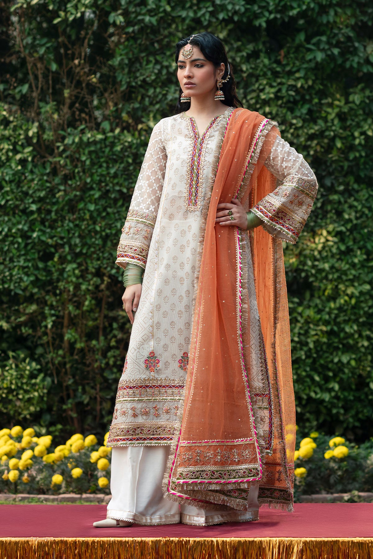 Timeless elegance in ivory, draped in tradition.This long organza cotton shirt, paired with luxurious silk wide-leg sharara pants, is a blend of grace and opulence. The golden block printing casts a soft sheen, while intricate organza and block print borders along the hem and sleeves create a harmonious fusion of textures. Colored resham and gota embroidery bring depth to the design, and the neckline is beautifully elevated with block print and gota work. Finished with contrasting Indian maghzis, gota lapas, and delicate laces, this ensemble radiates refinement and beauty. Note: Duppata price is not included in price.