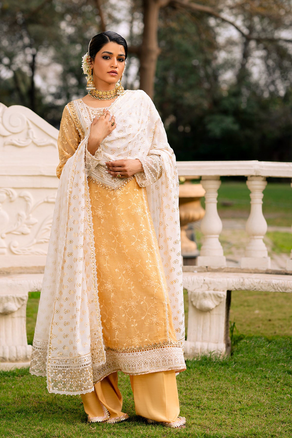 White georgette foil print with gota border and lappa edging. Subtle yet stunning.