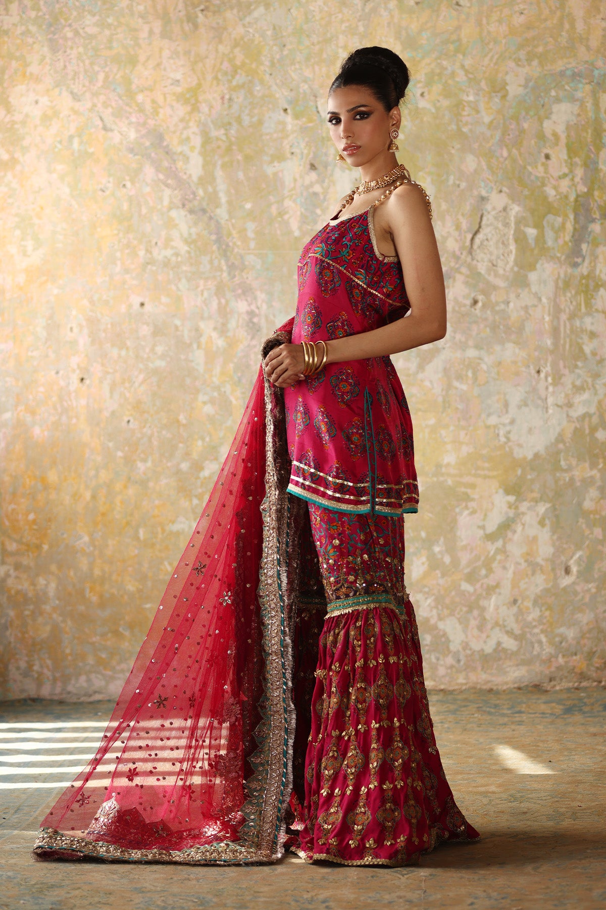Block printed short shirt with pearl straps, paired with a gota tilla marori and zardozi work gharara in matching block print. Note: Duppata Price is not included.