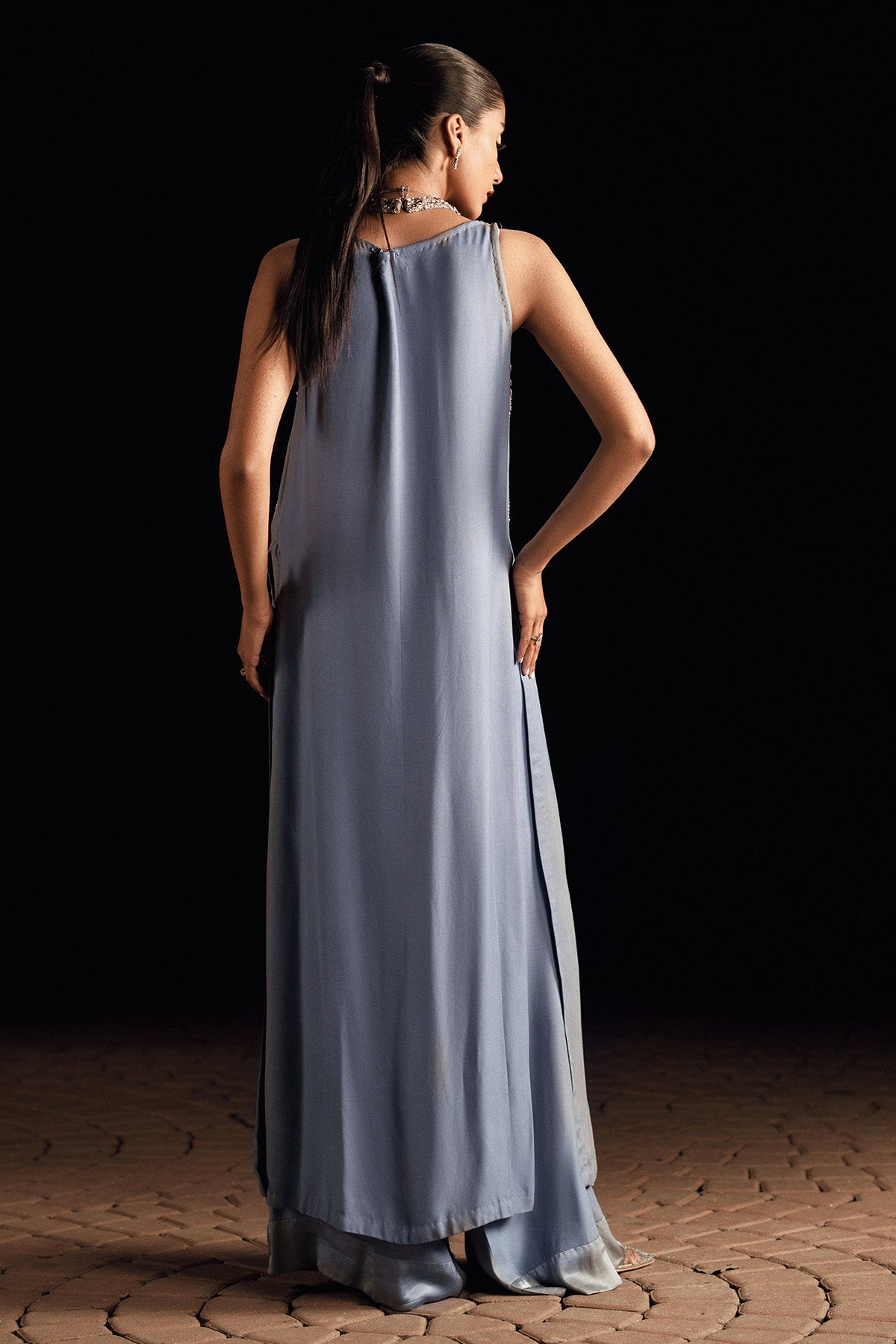 A long, front-open sleeveless jacket in georgette, featuring a sleek buttoned design and statement side slits. The embellished neckline and blouse straps shine with colored stones, crystals, sequins, and pearls, adding the perfect touch of glamour. Paired with matching georgette pants with silk finishing for a luxurious finesse.