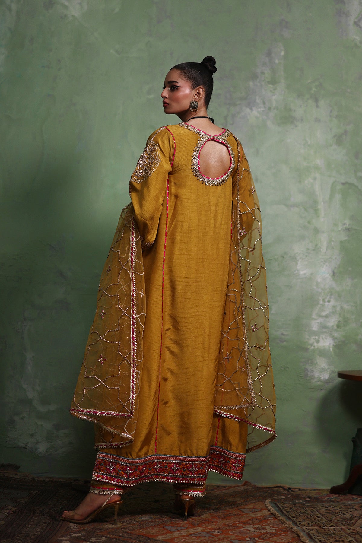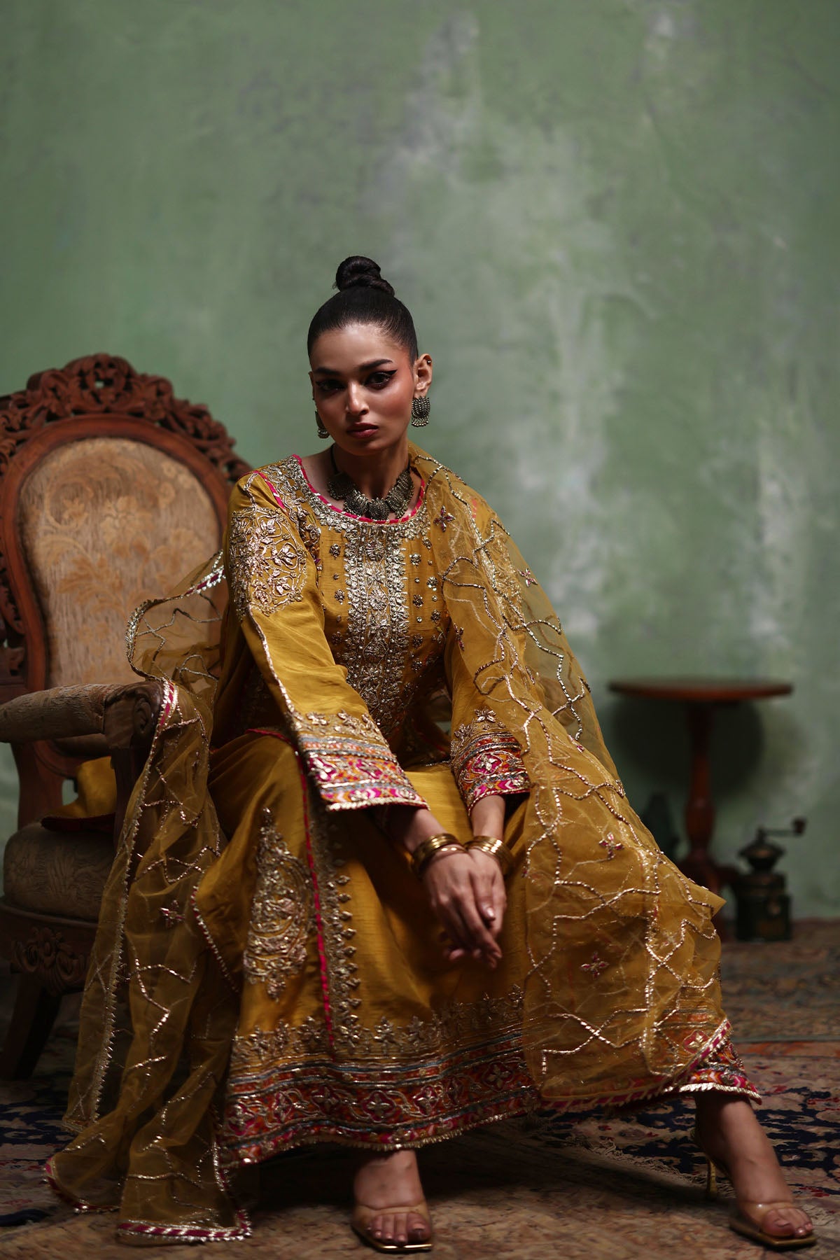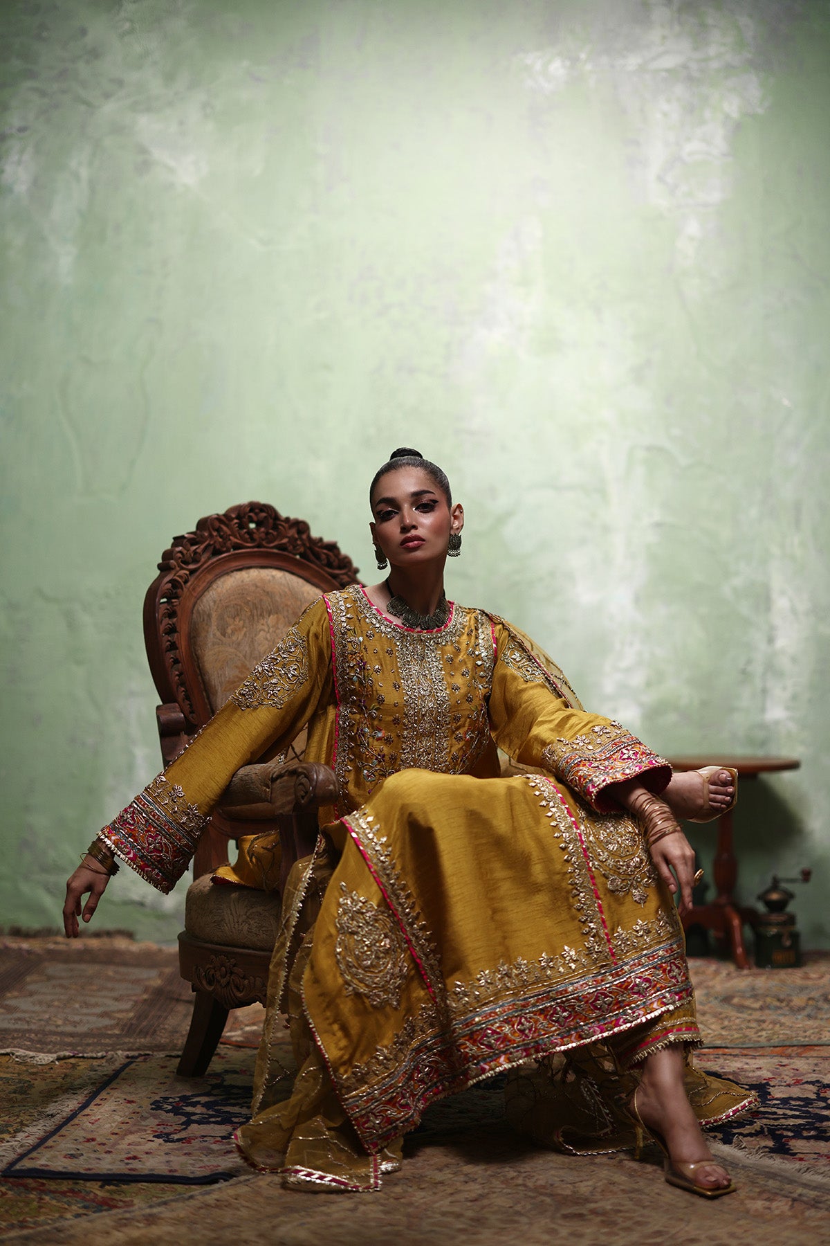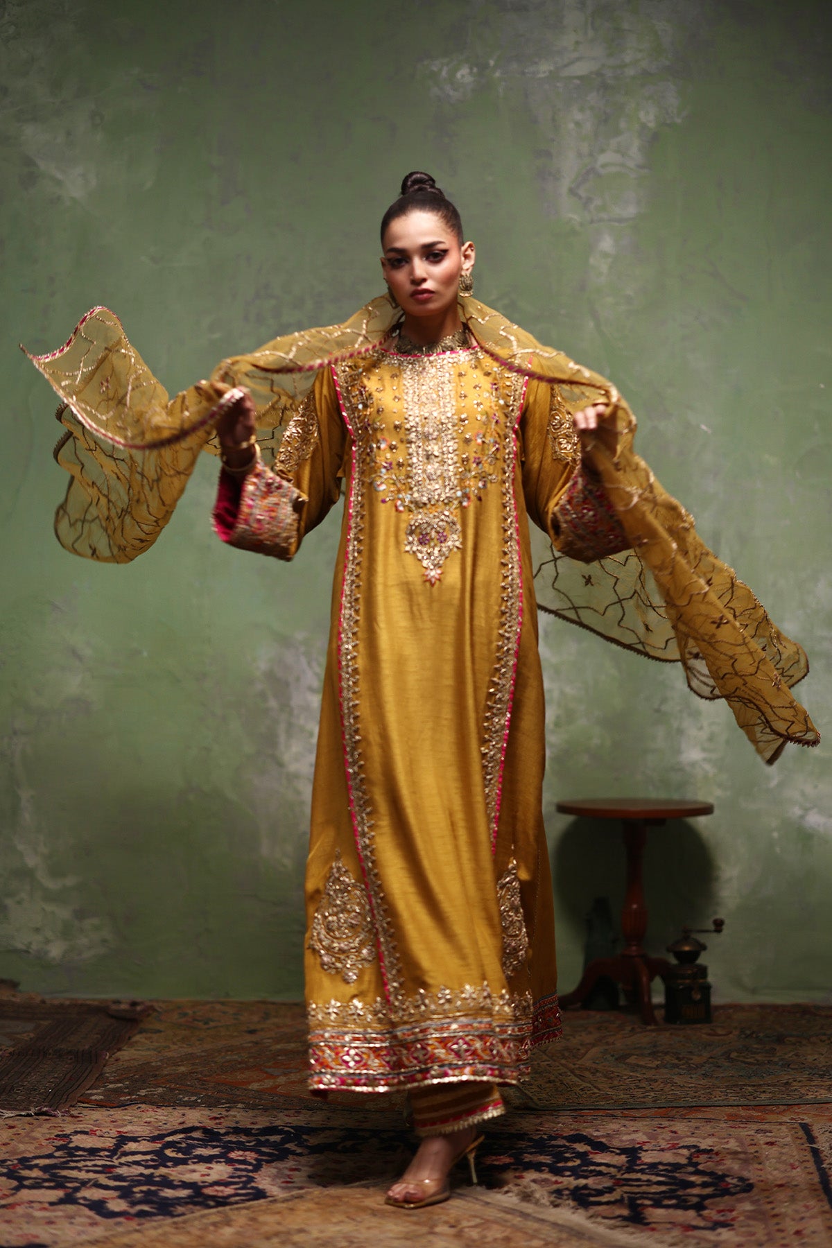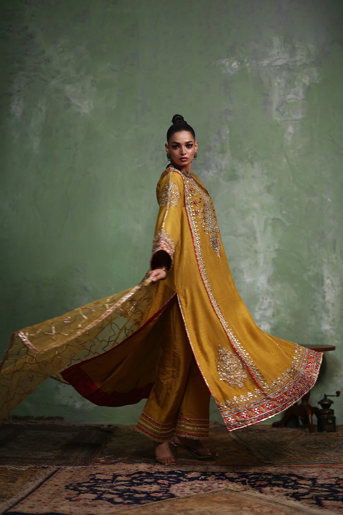 Crafted in luxurious Korean raw silk, this A-line silhouette is brought to life with contrasting hand block–printed borders, delicately highlighted with gotta work along the hem and sleeves. The neckline is enriched with intricate thread embroidery and refined adda detailing, while matching raw silk pants echo the look with coordinated block prints and gotta finishes. NOTE: Duppata price is not included. Dupatta code is NFC-D-06 dupatta Price 49,000/-