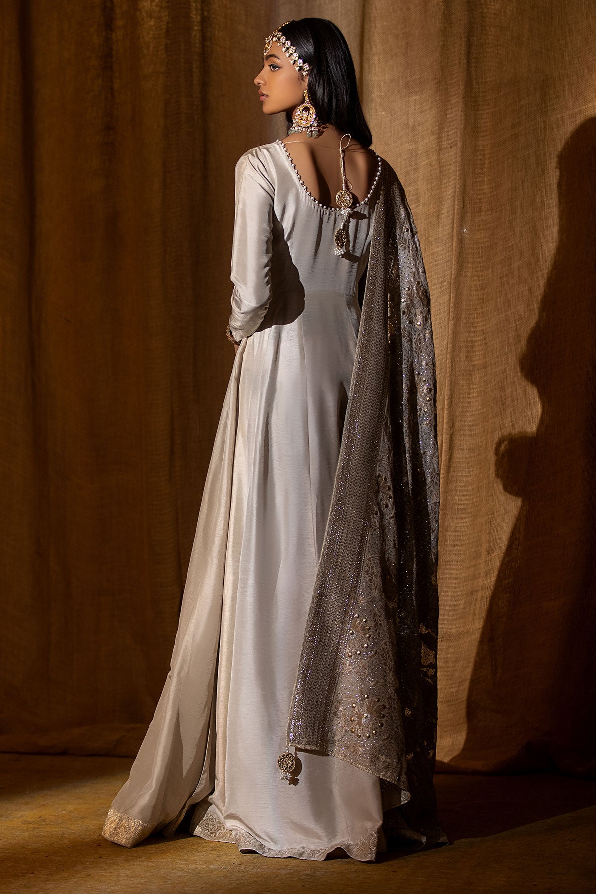 A long kalidar pishwas featuring pure jamawar borders and pearl finishing with a traditional low back further enhanced by traditional tassels. Note: Shawl price is not included