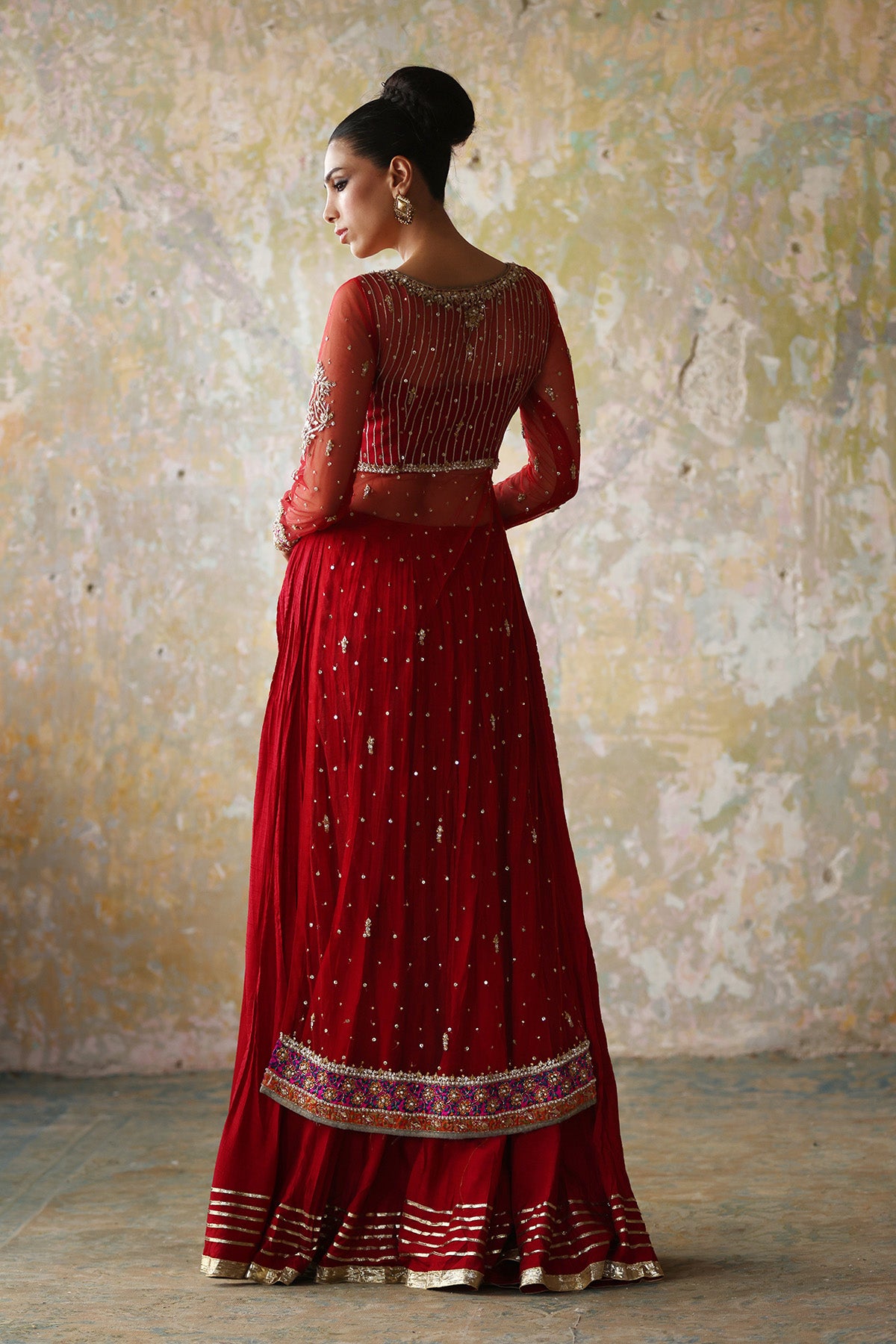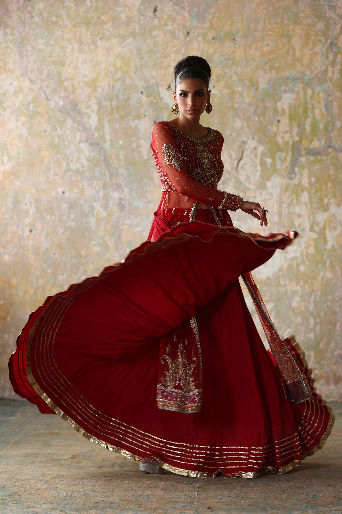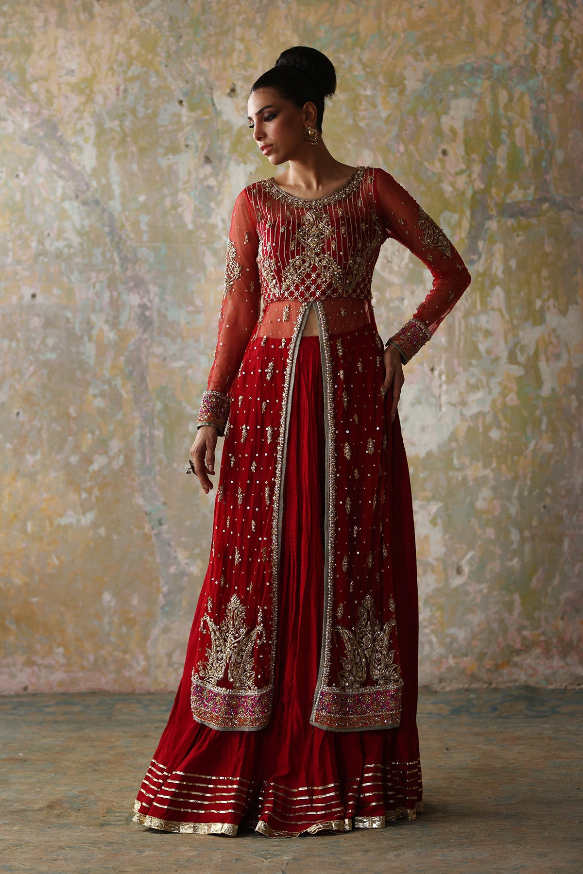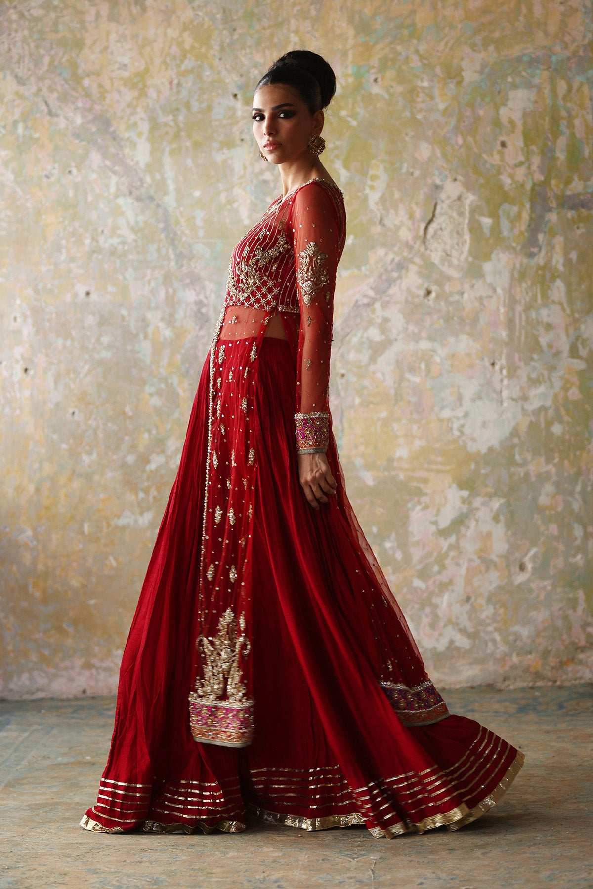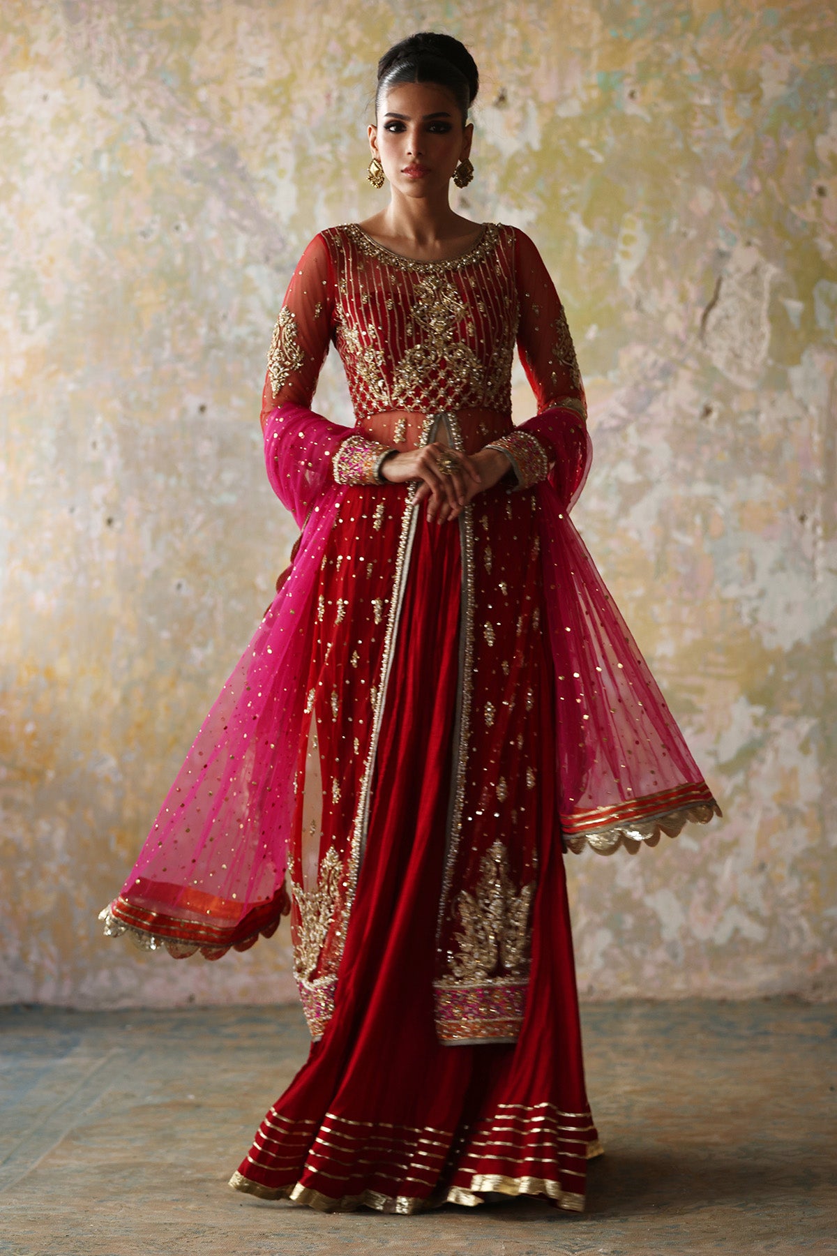 Red front open net gown with traditional embellishments of gota lappa and ganga jamni further enhanced with a crushed silk lehnga and a mukesh net duppatta in magenta with gota shimmer lace on edges.