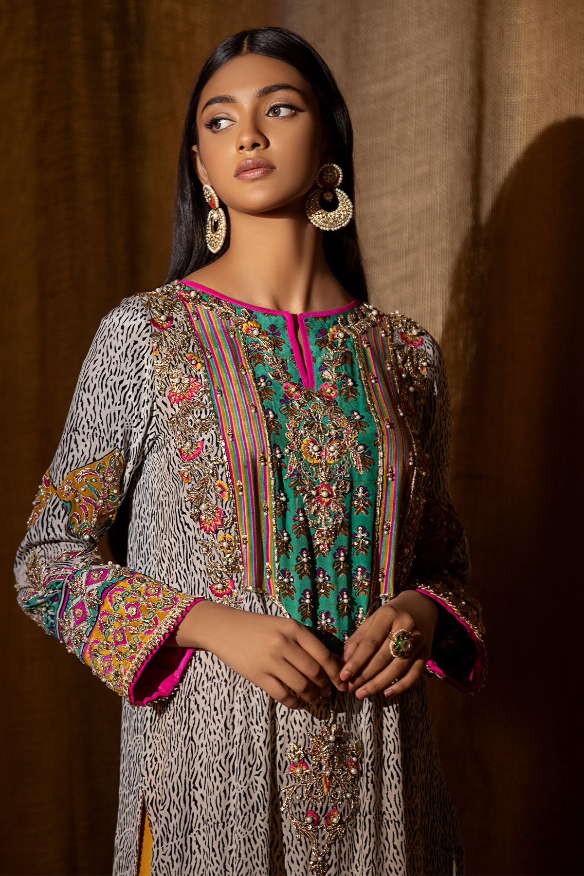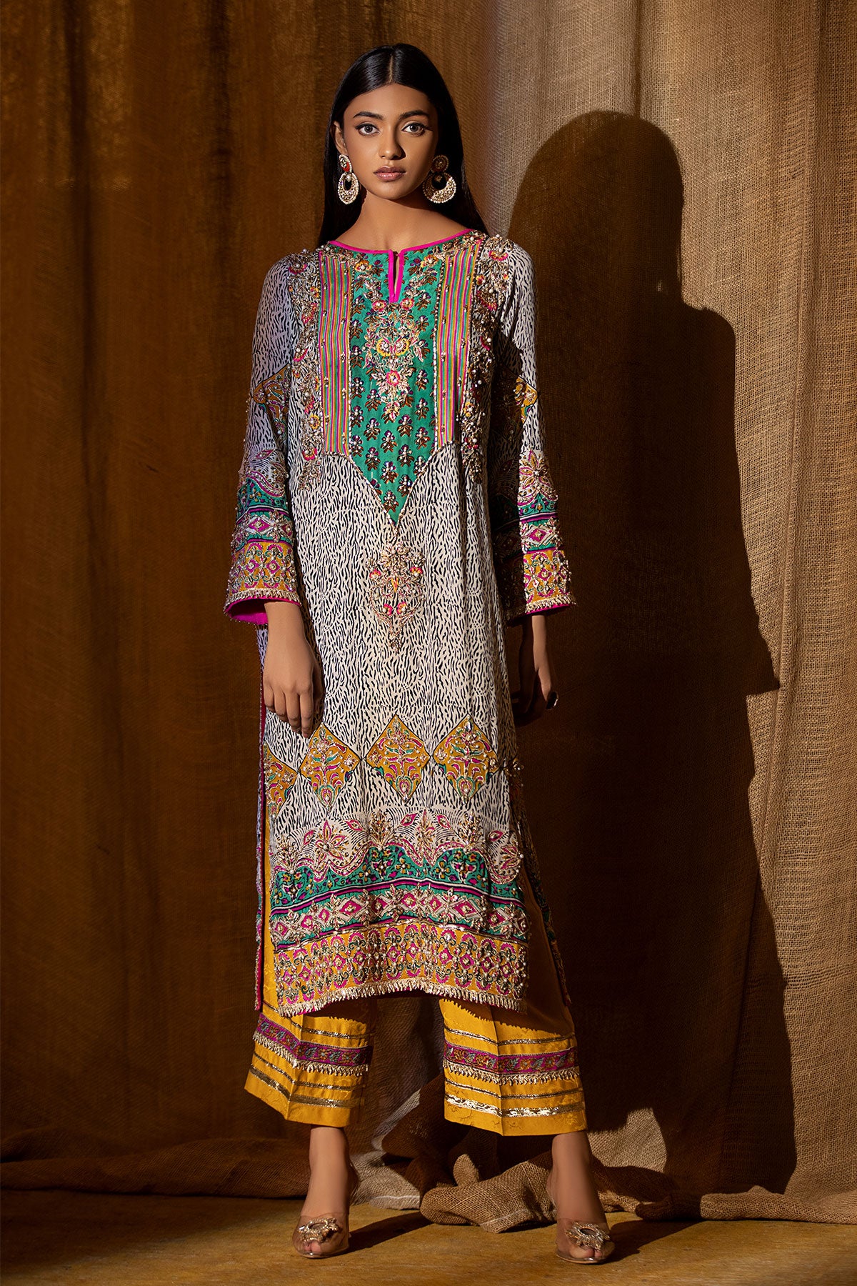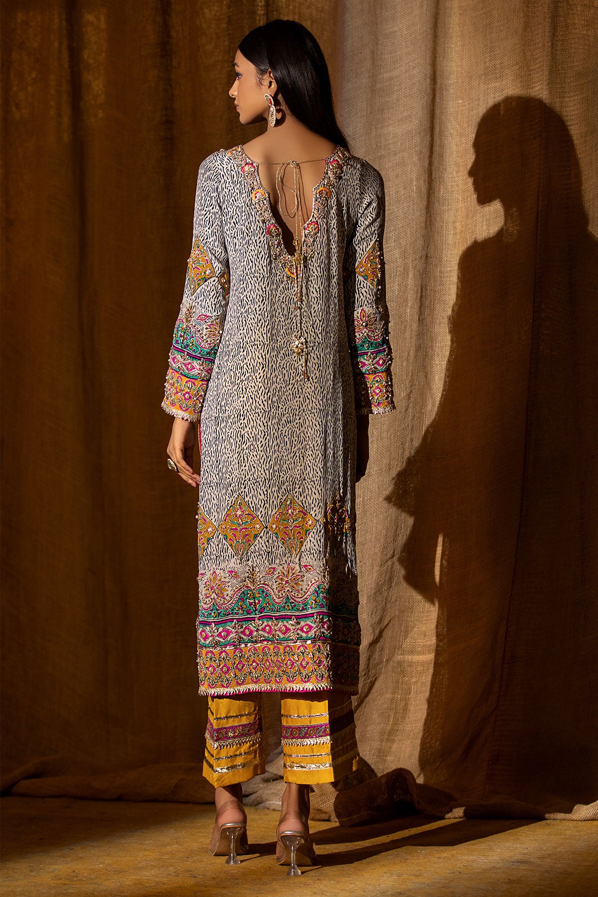 Hand block printed shirt with vibrant embellishments on neckline, sleeves and a very unique back neck cutline paired with embossed silk straight pants with gota on hem.