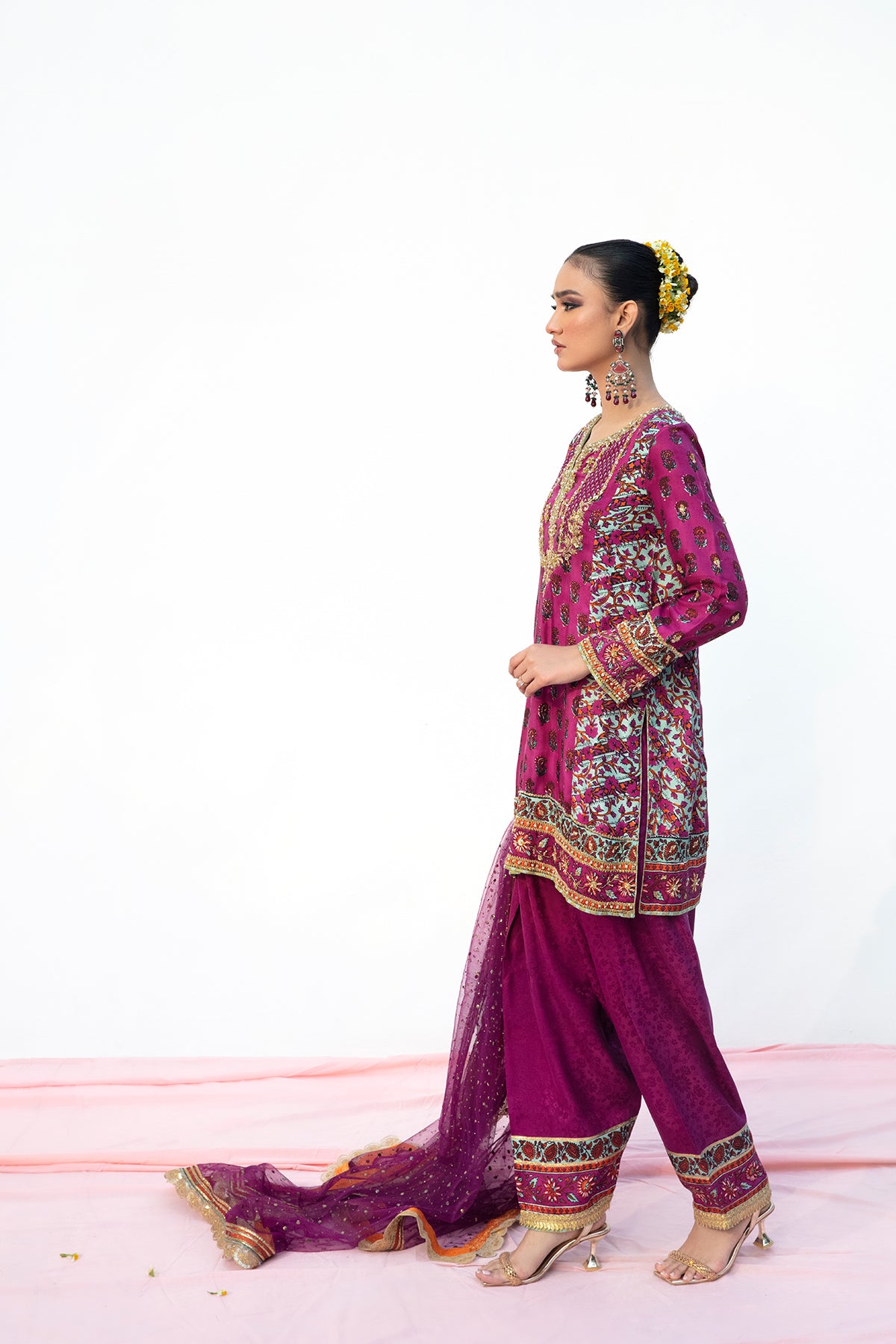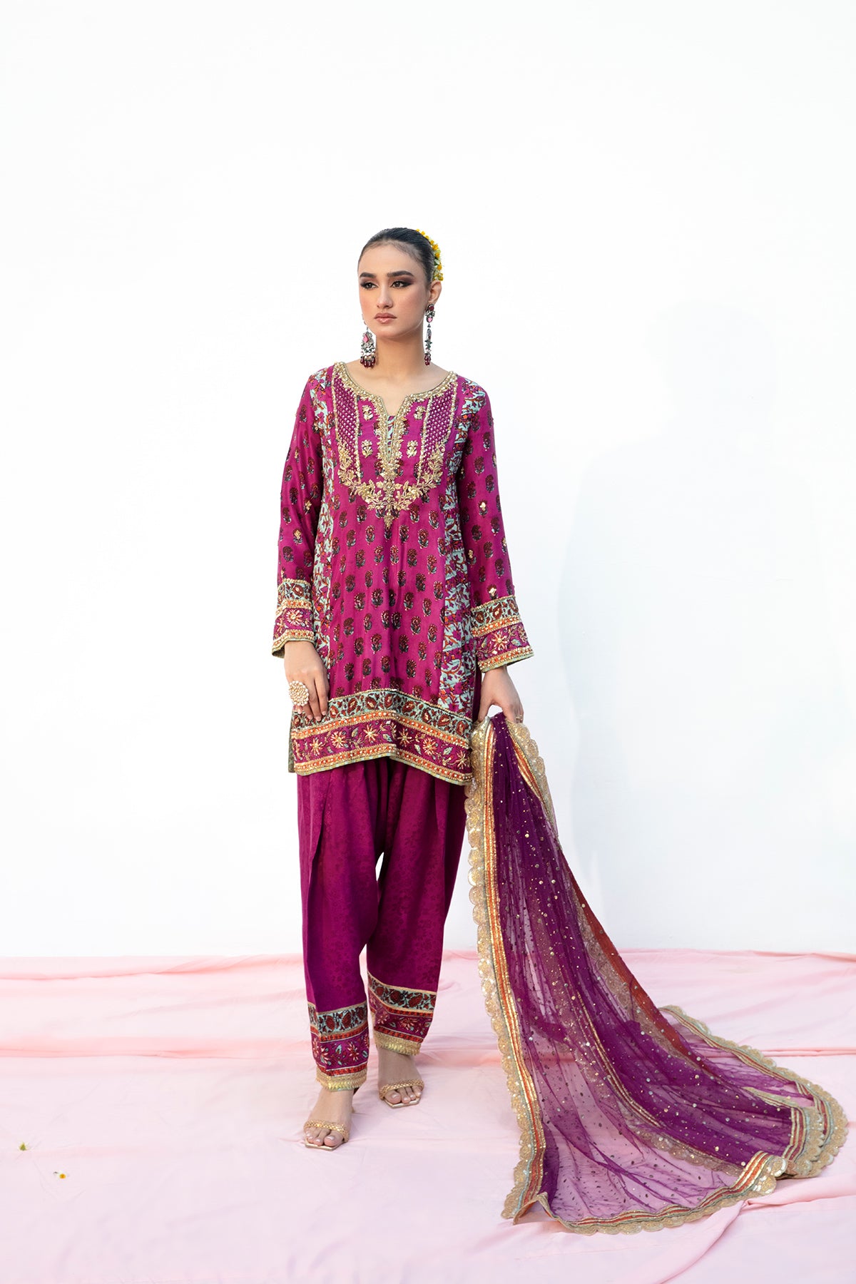 A short block print shirt heavily embellished with gota naqshi & dabka work further enhanced with gotta & lappa at the hem. Paired with a silk shalwar. P.S: Duppata price is not included