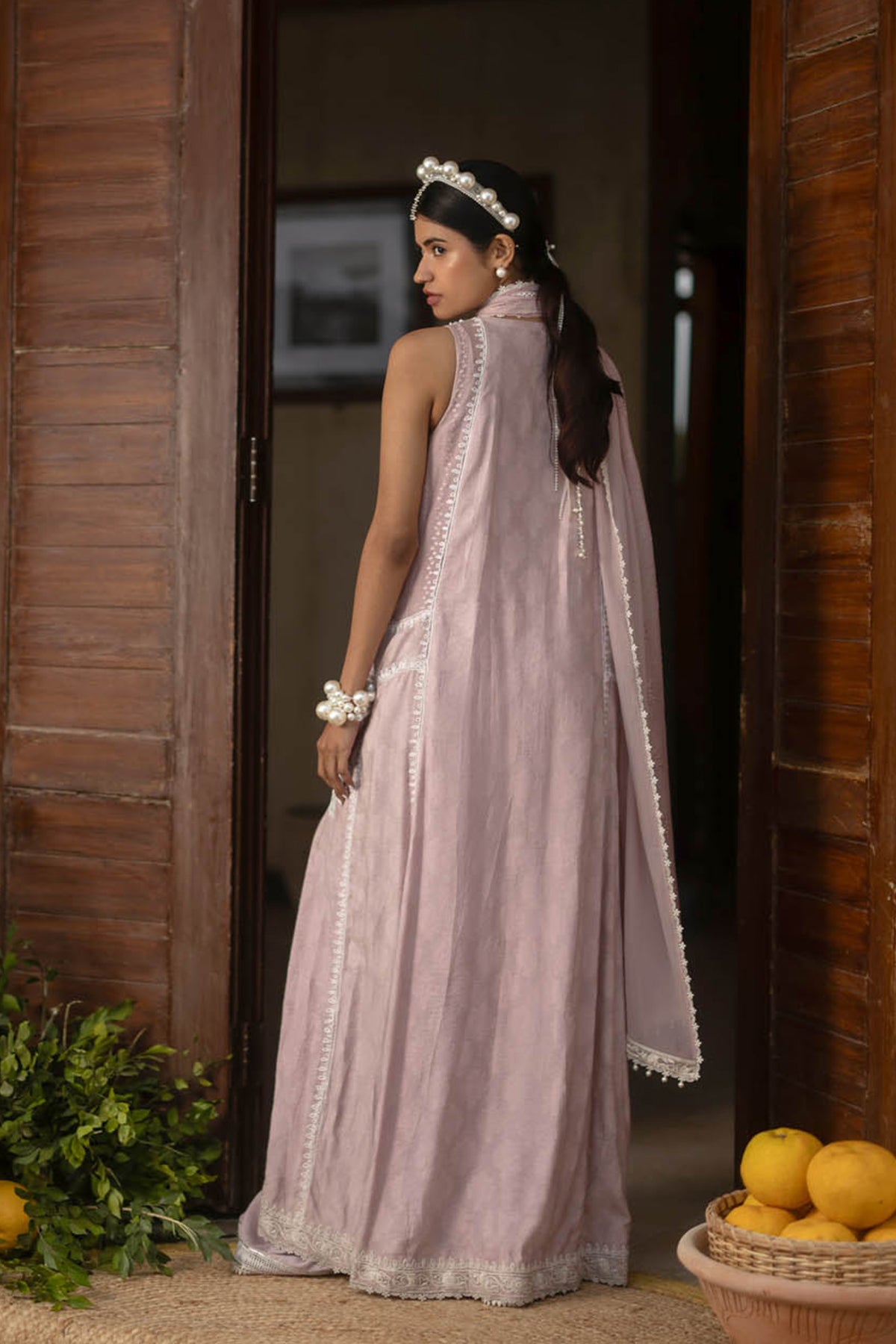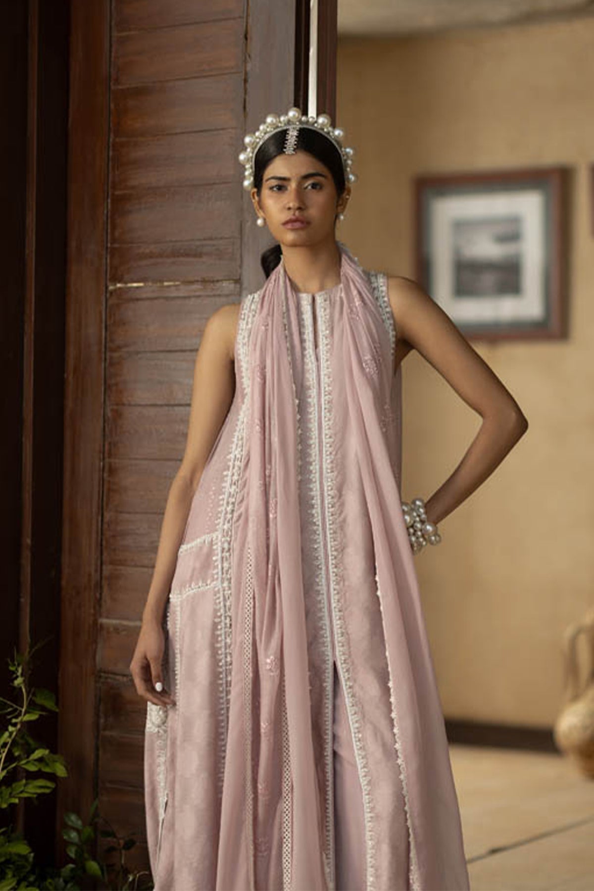 This panelled front-open shirt, crafted in delicate cotton net, is adorned with pearl-white resham embroidery that gracefully traces the neckline, centre front, hemline, side slits, and flowing panels. Intricate hand embellishments of pearls, crystals, and stones add a luminous sparkle, while soft white lace finishes lend a touch of timeless charm. Paired with matching flared sharara pants in silk, detailed with a refined white resham embroidered border, and layered over a silk inner slip for effortless coverage. Note: Dupatta Price is not include. Dupatta Code SC-D-06-26-1 Price 23,000/-