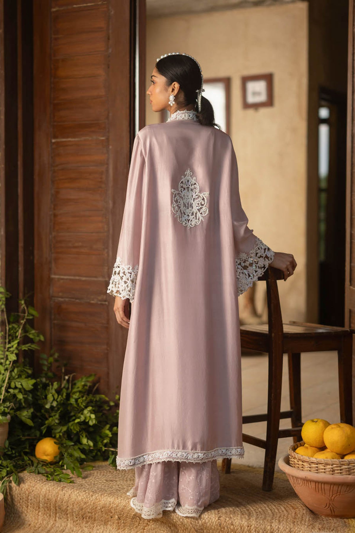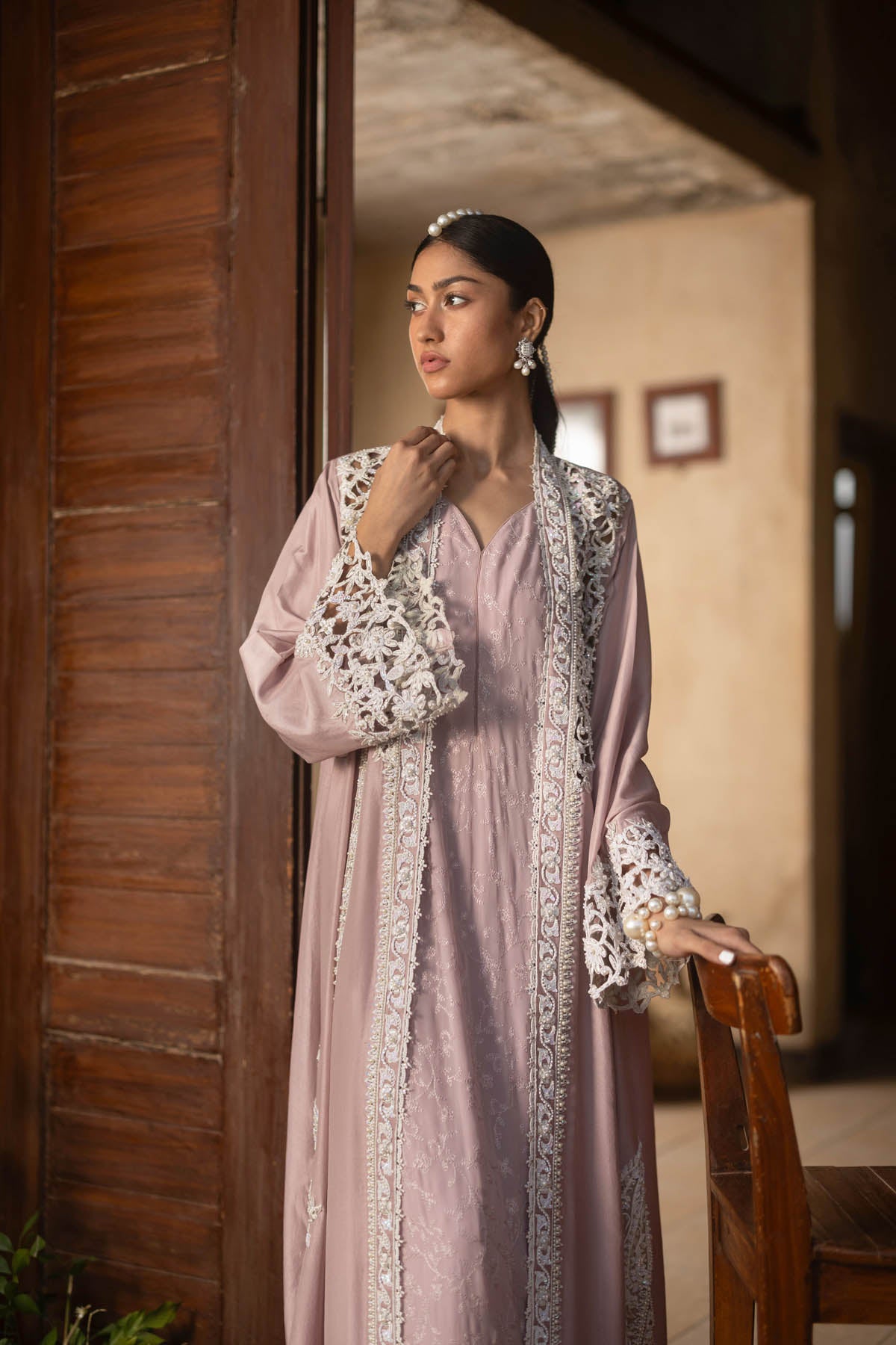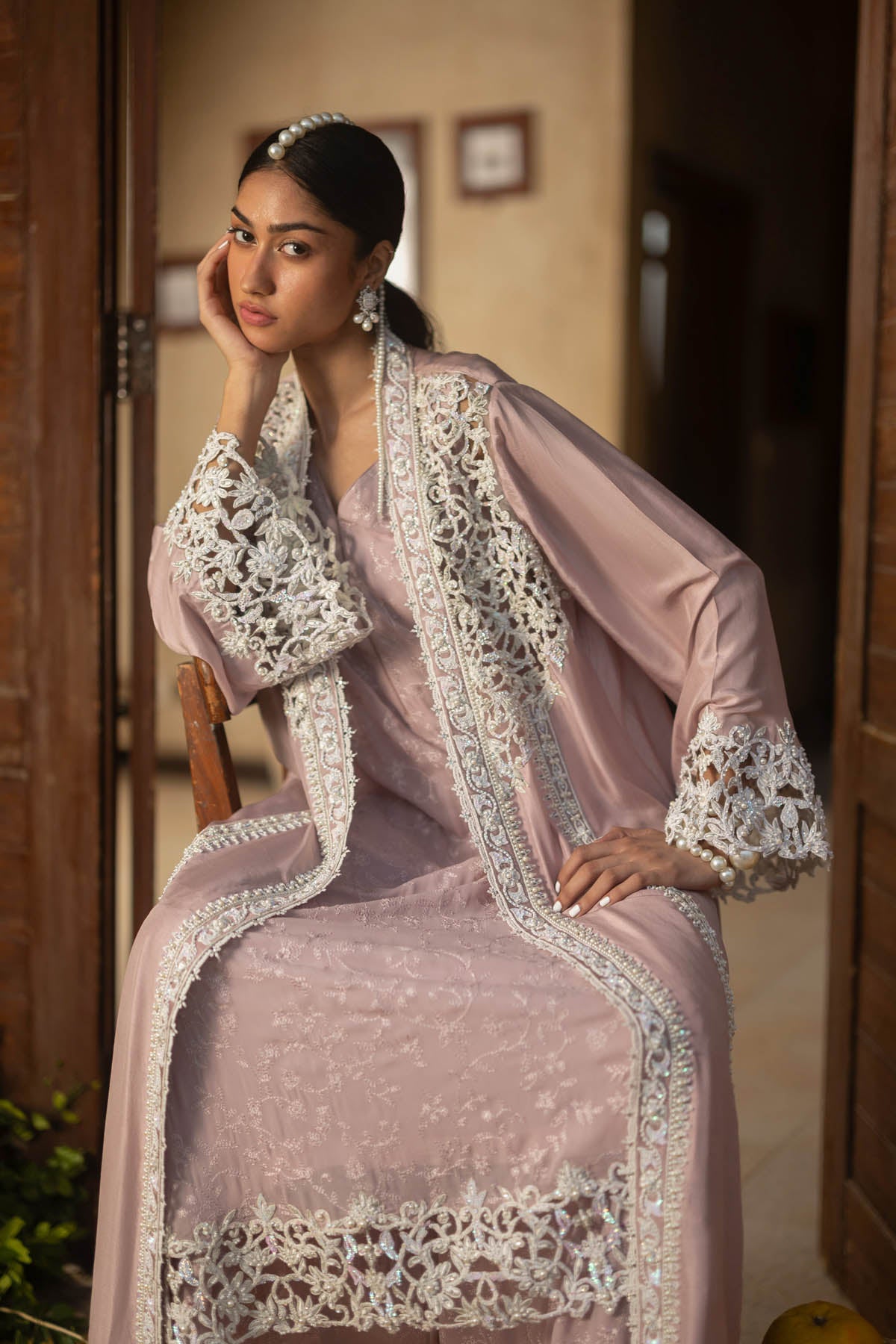 This front-open gown in pure raw silk is a vision of refined elegance, adorned with resham embroidered borders and delicate corner motifs, intricately highlighted with pearls, crystals, and stone work. Fine cutwork along the neckline and sleeve hems adds a layer of softness and femininity Layered over a fully lined georgette inner shirt in matching blush, beautifully detailed with tonal resham embroidery and cutwork at the hem, the ensemble feels cohesive yet richly textured. Paired with coordinating flared pants featuring a white resham embroidered border.