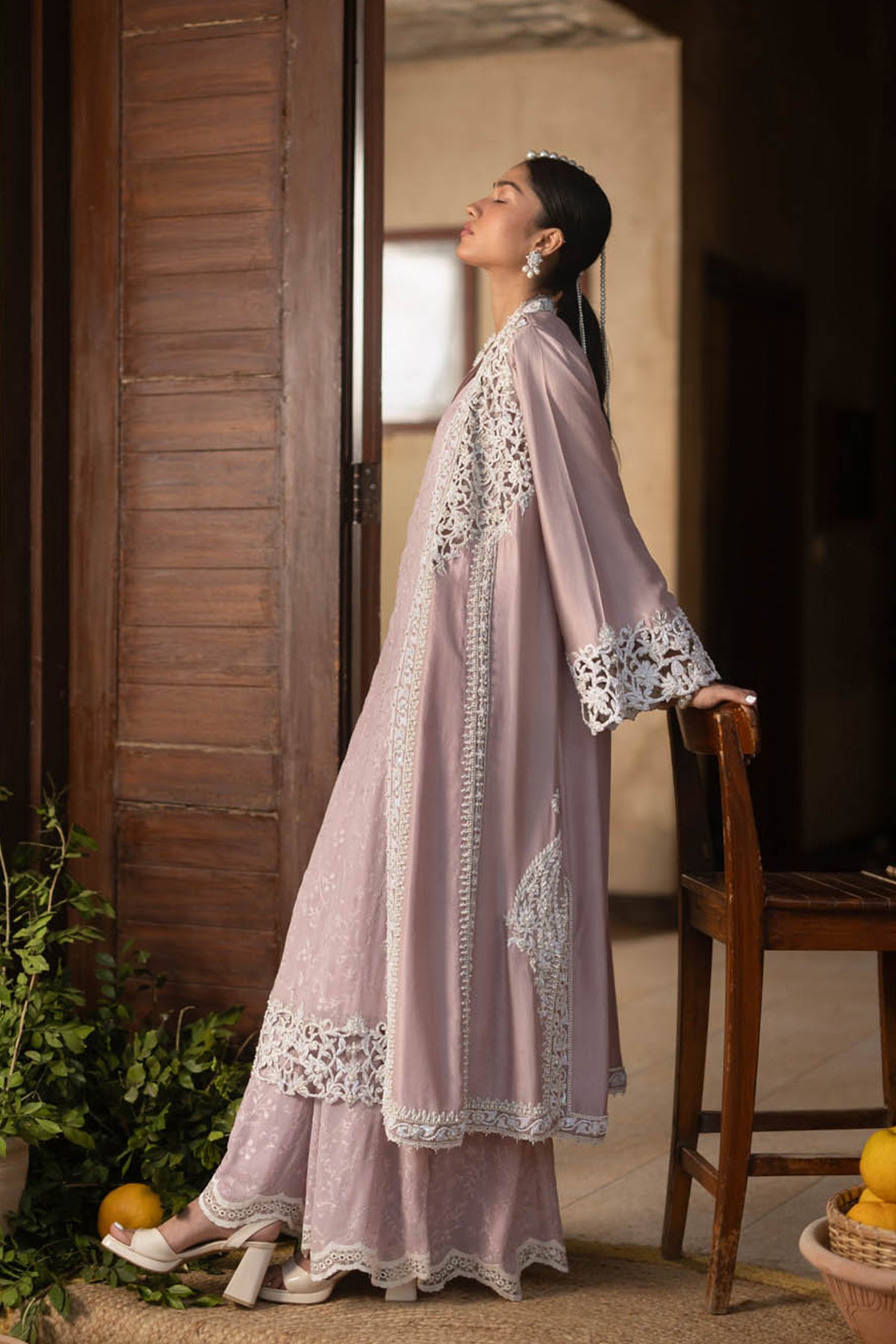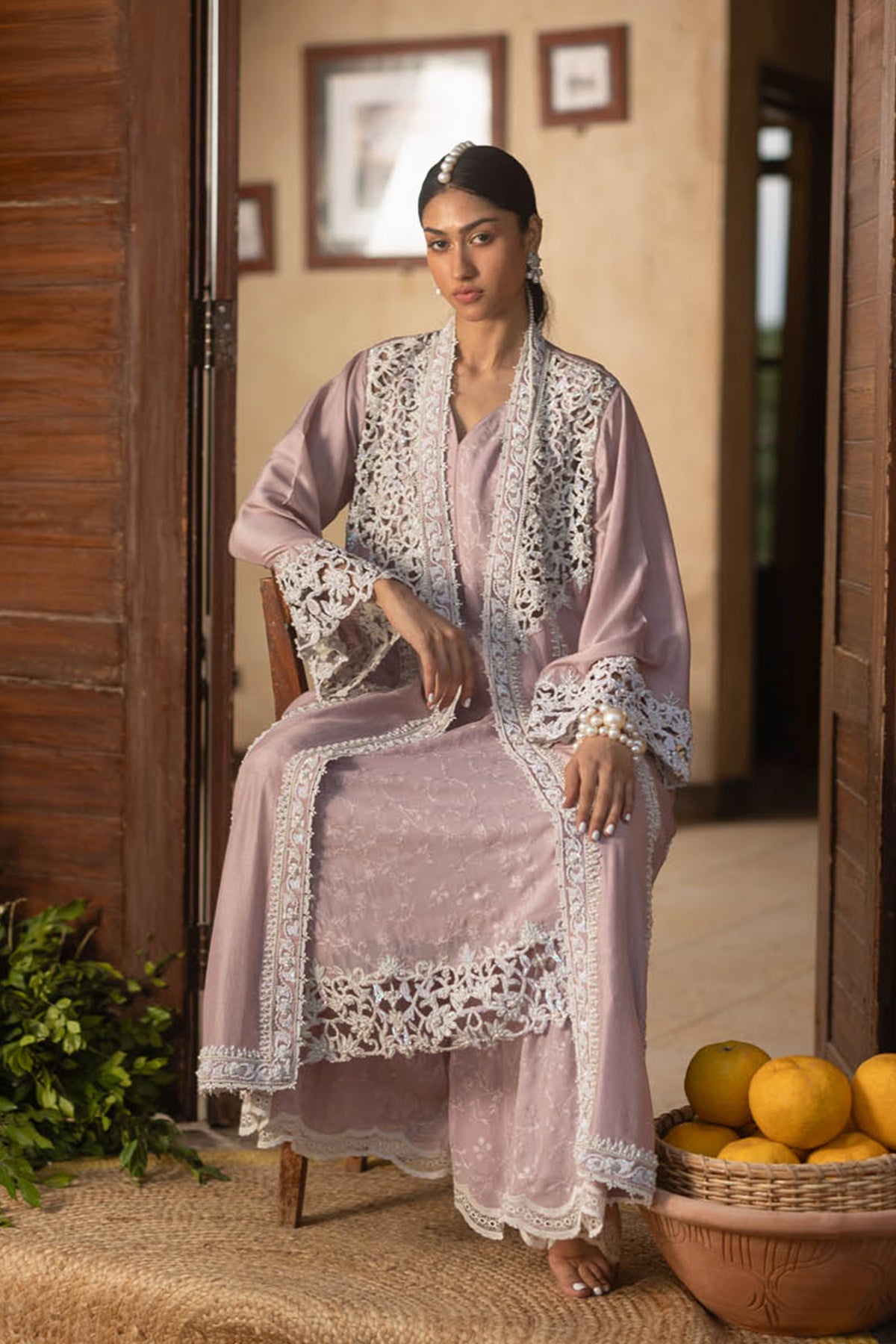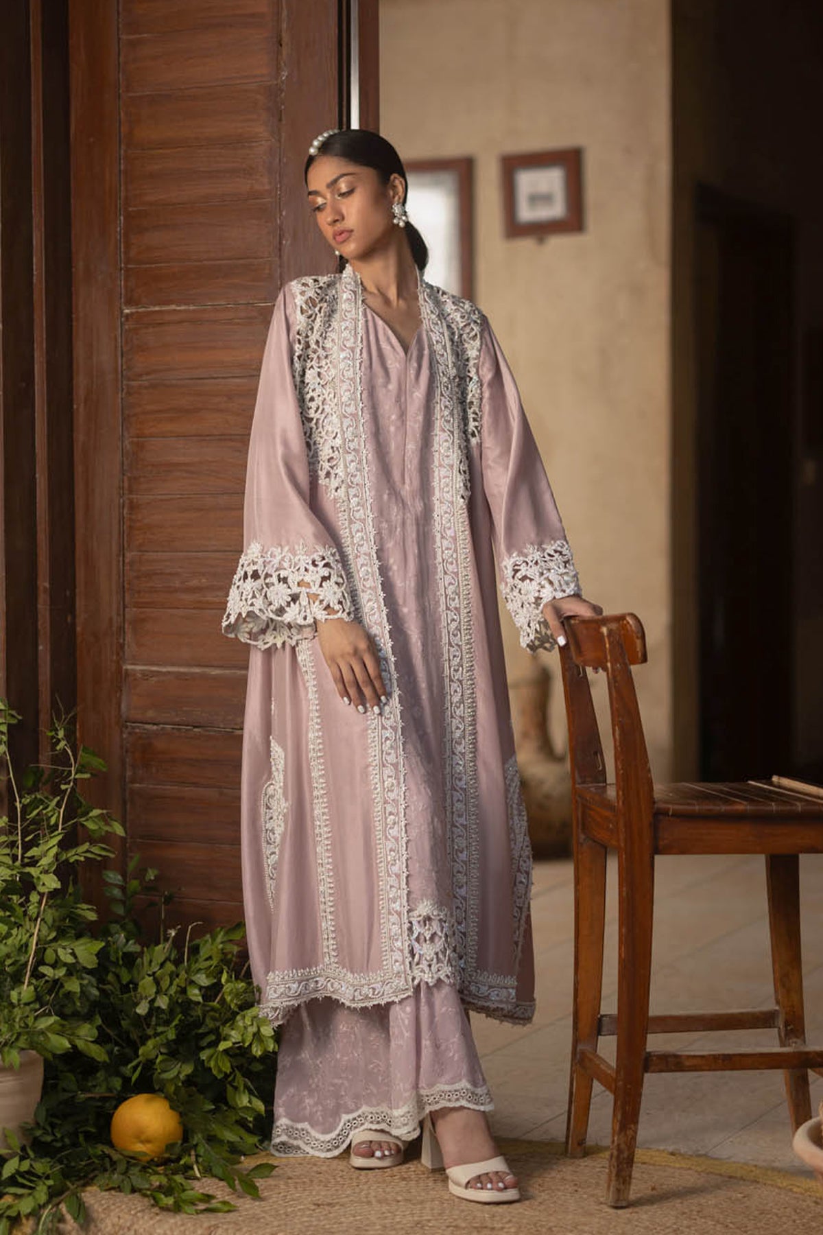 This front-open gown in pure raw silk is a vision of refined elegance, adorned with resham embroidered borders and delicate corner motifs, intricately highlighted with pearls, crystals, and stone work. Fine cutwork along the neckline and sleeve hems adds a layer of softness and femininity Layered over a fully lined georgette inner shirt in matching blush, beautifully detailed with tonal resham embroidery and cutwork at the hem, the ensemble feels cohesive yet richly textured. Paired with coordinating flared pants featuring a white resham embroidered border.