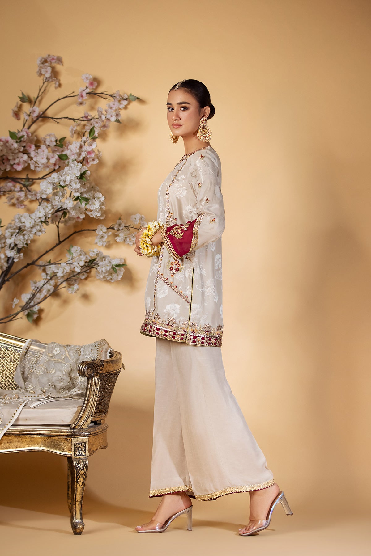 This ivory & maroon short silk kurta is a beautiful and sophisticated choice for any occasion, the kurta is adorned with exquisite gota and resham embroidery on the hem and neckline, creating a stunning and eye-catching effect. Paired with azaar pants.