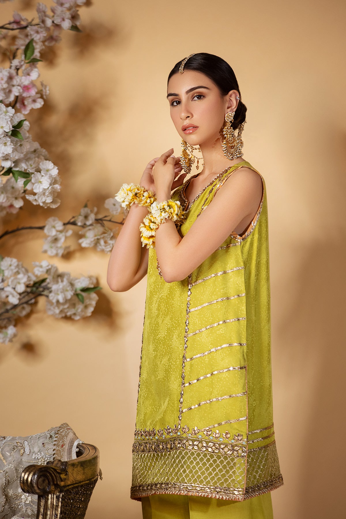 This lime green silk short shirt,features delicate gota embellishments on the neckline, hemline, and panels of the shirt. The intricate gota work adds a touch of glamour and enhances the overall aesthetic appeal of the shirt. The combination of lime green silk and light gota work creates a stunning contrast, making the shirt stand out in a crowd.