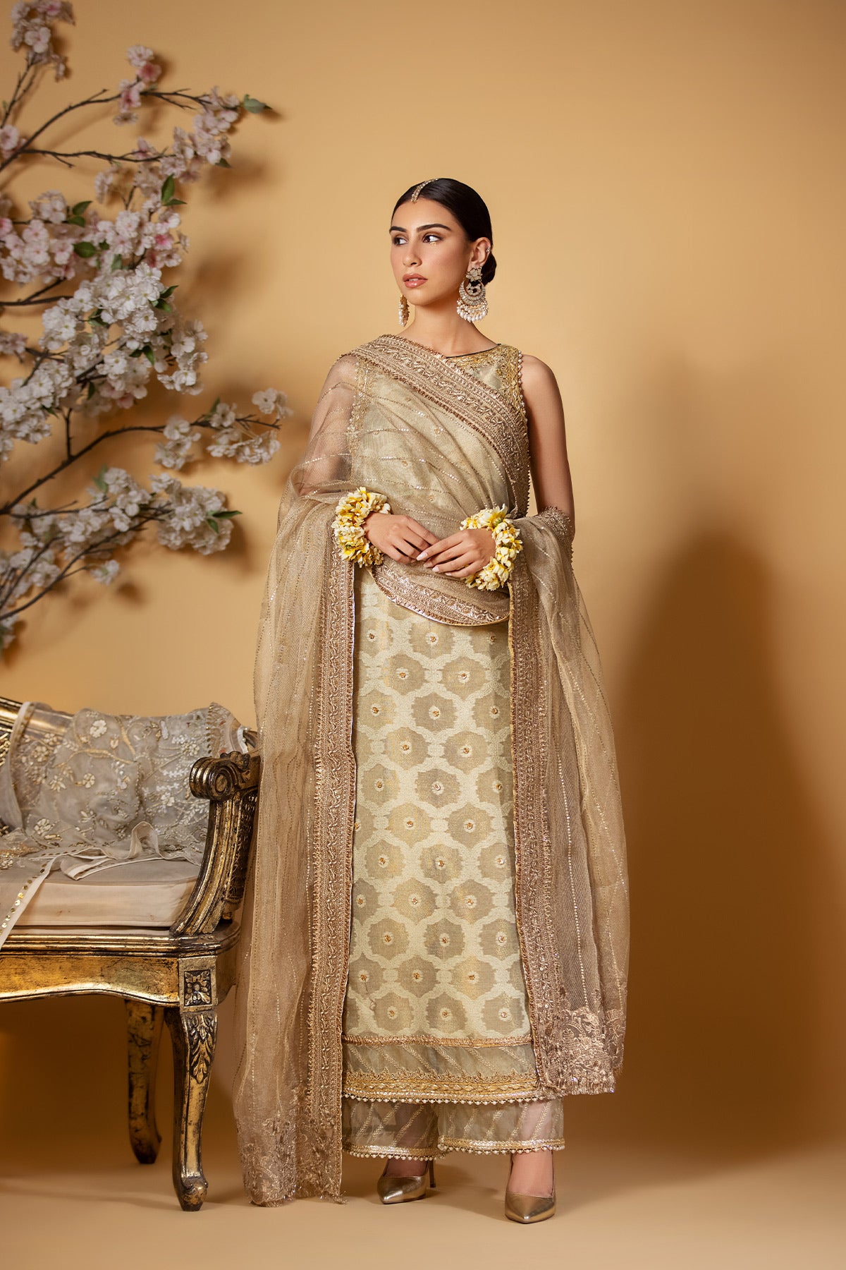 This stunning pistachio green sleeveless shirt is the epitome of elegance. The long and sleek design is crafted with precision and features delicate gota embellishments on the hemline, neckline, and armhole. The light gota work adds a touch of glamour and enhances the overall aesthetic appeal of the shirt. The shirt is beautifully finished with emerald green cotton net pippings that add a contrasting yet complementary color to the pistachio green shade. Paired with the shirt are silk culottes that provide a comfortable and stylish fit. Note: Duppata price is not included