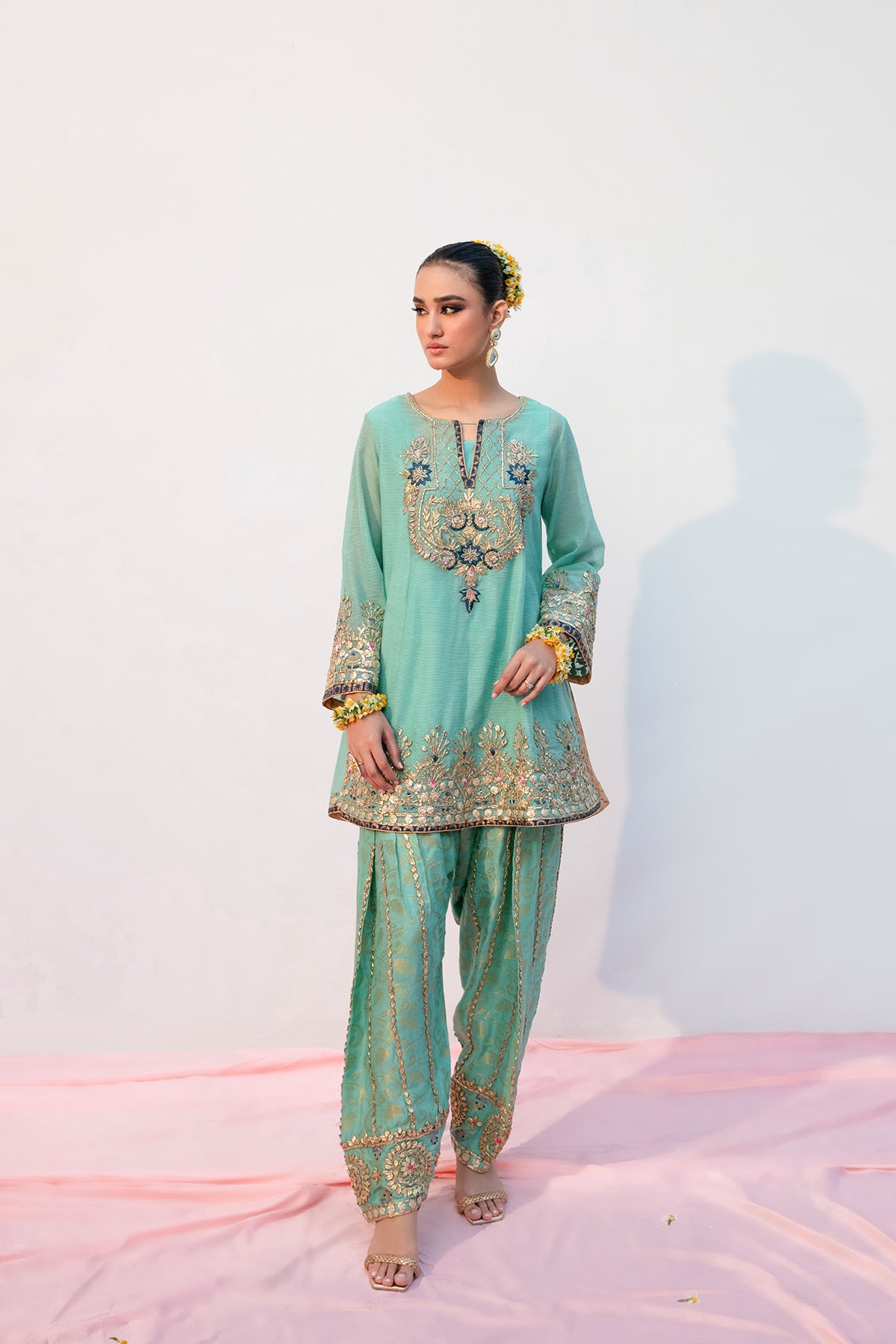 A short A-line karandi kurta adorned with gota work on the hem, sleeves and neckline. Paired with a traditional gotta embroided zari cotton net shalwar.