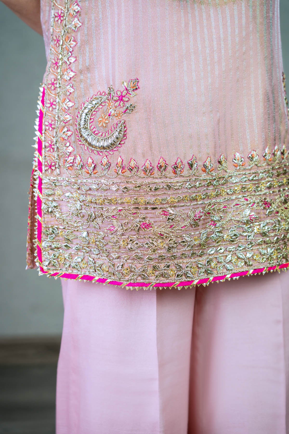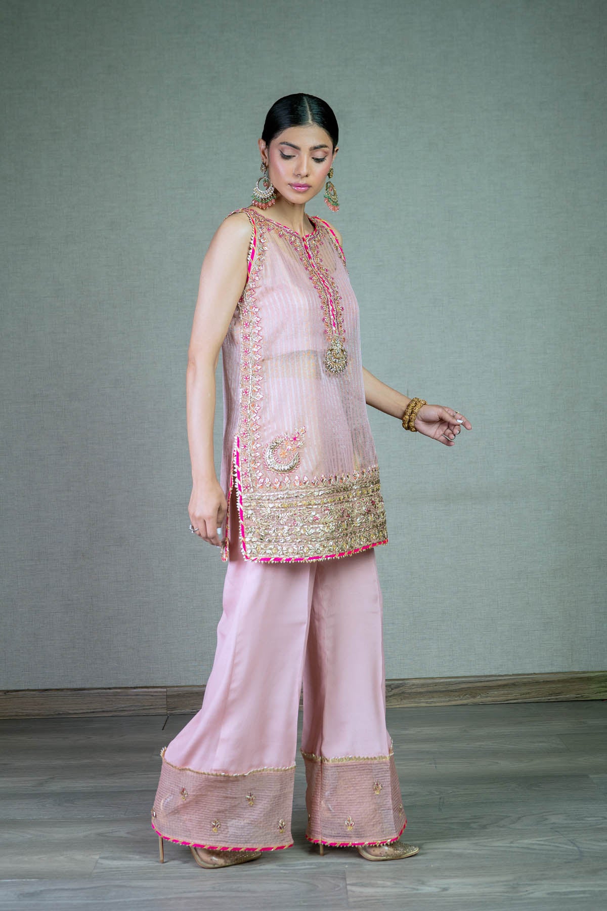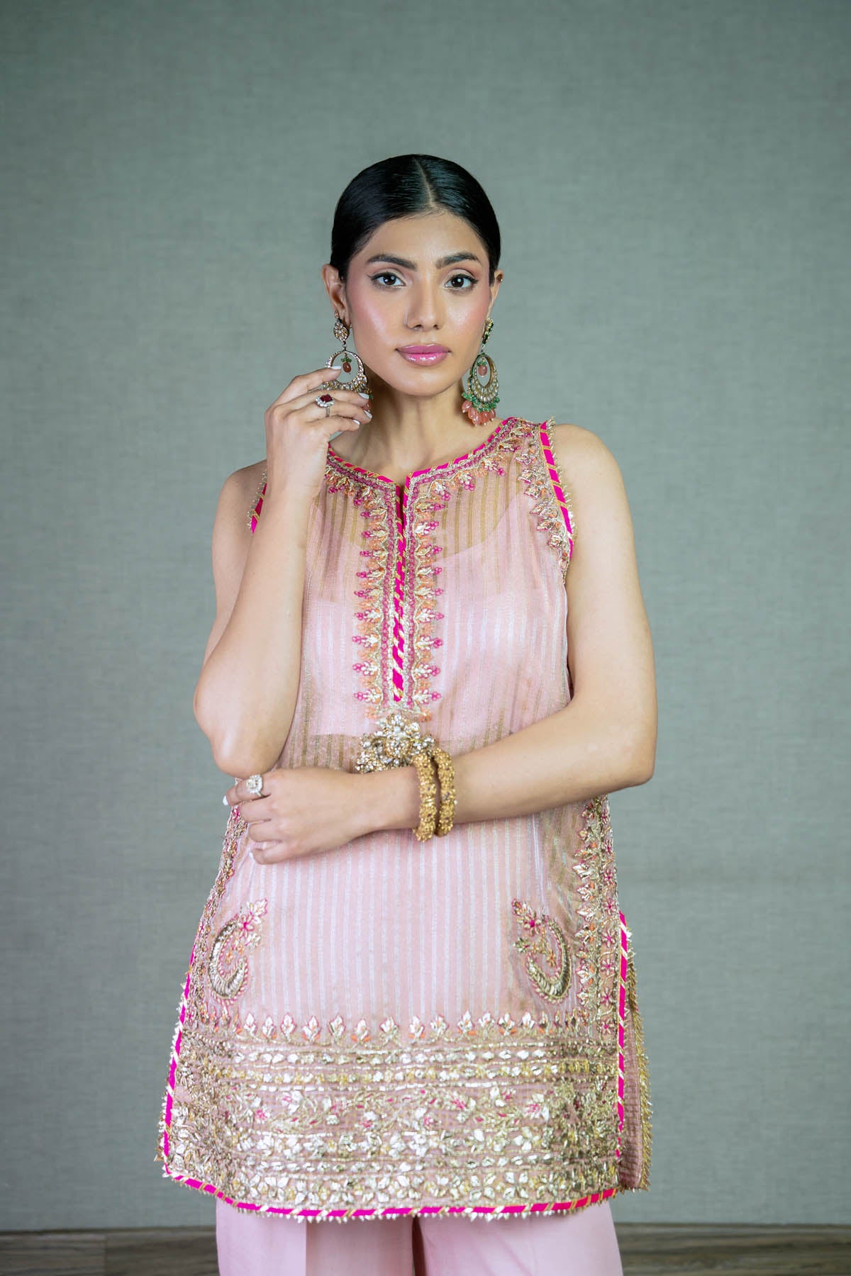 This short lime green kurta is crafted from shimmering silver zari net fabric. The halter neckline adds a modern twist, while intricate gota and resham work, complemented by tilla embroidery, exude timeless elegance. Enhanced with delicate gota finishes, the ensemble is paired with a matching silk blouse and green silk pants adorned with matching gota work.