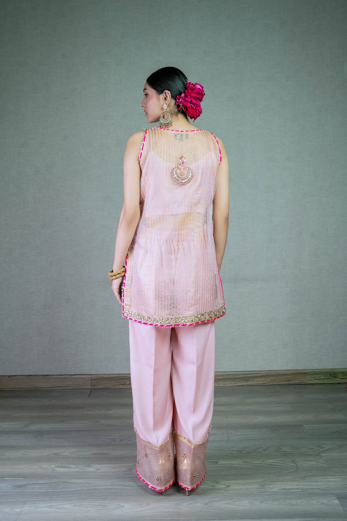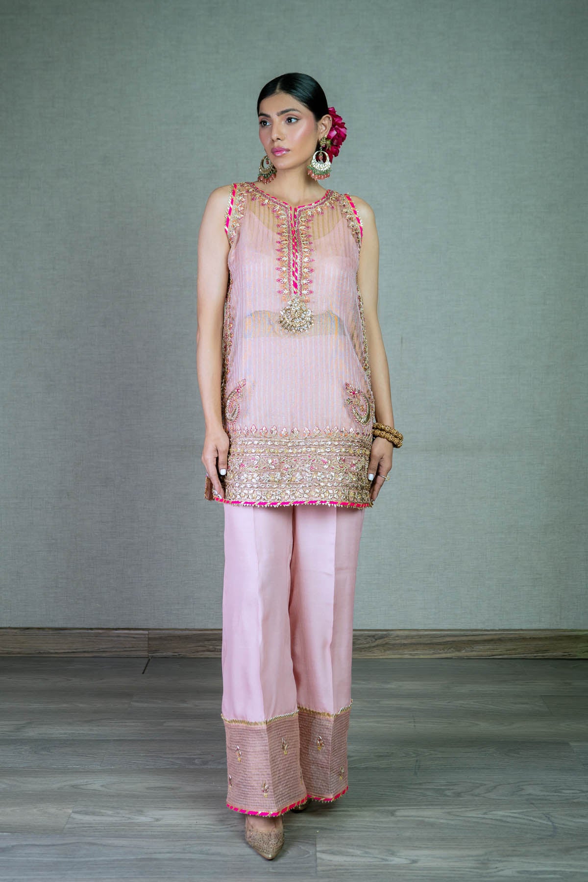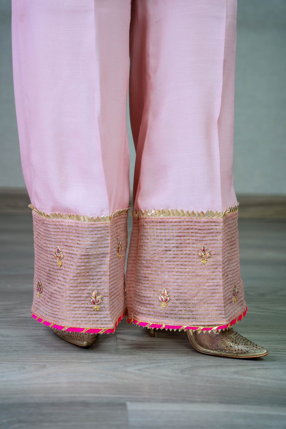 This short lime green kurta is crafted from shimmering silver zari net fabric. The halter neckline adds a modern twist, while intricate gota and resham work, complemented by tilla embroidery, exude timeless elegance. Enhanced with delicate gota finishes, the ensemble is paired with a matching silk blouse and green silk pants adorned with matching gota work.