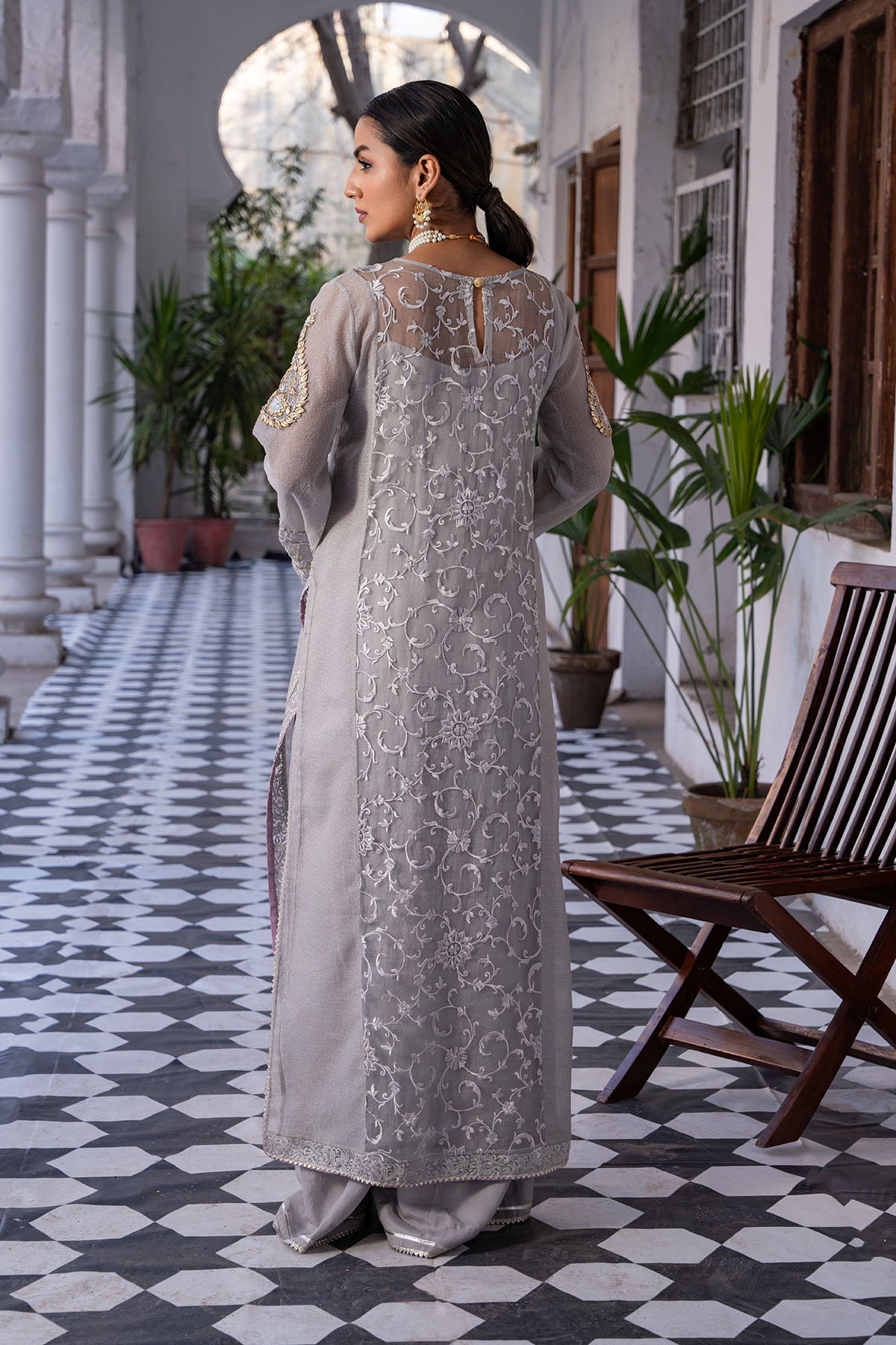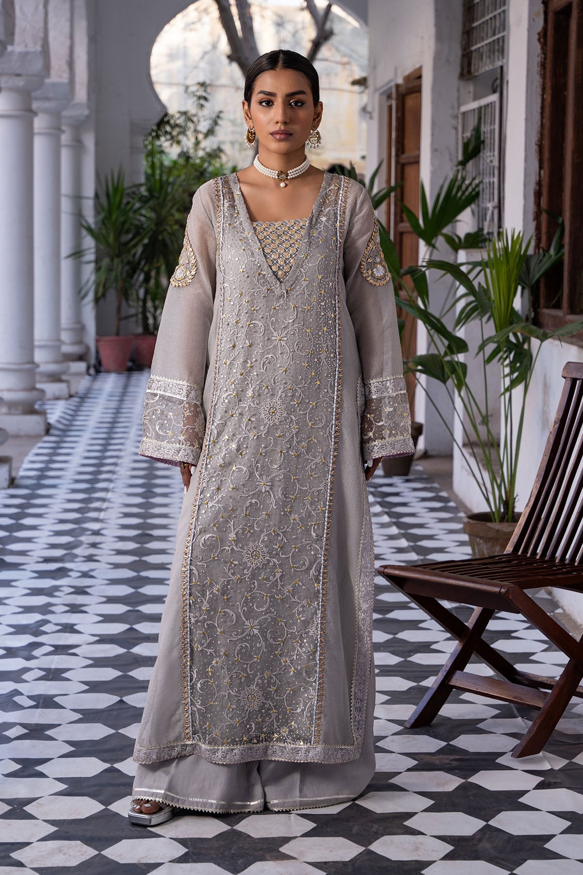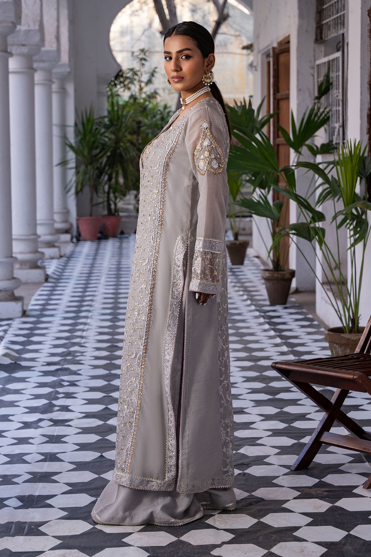 Step into enchantment with this ethereal long moonstruck grey kameez, a canvas of subtle sophistication. The central panel, adorned with intricate gold and silver mukesh, captivates with its celestial allure. Gota work delicately graces the neckline, sleeves, and panel lines, while organza borders on the sleeves add a touch of grace. Finished with contrasting pipings and regal kingree.