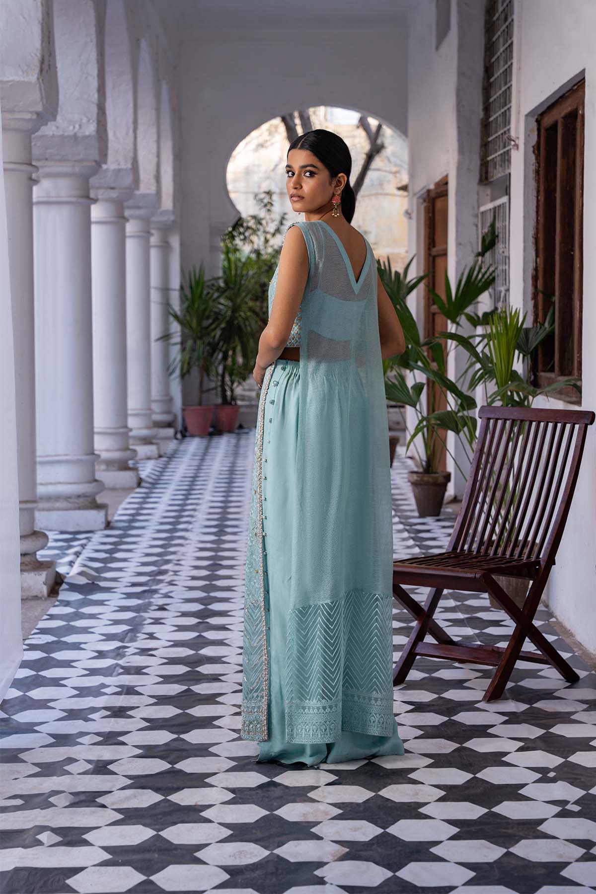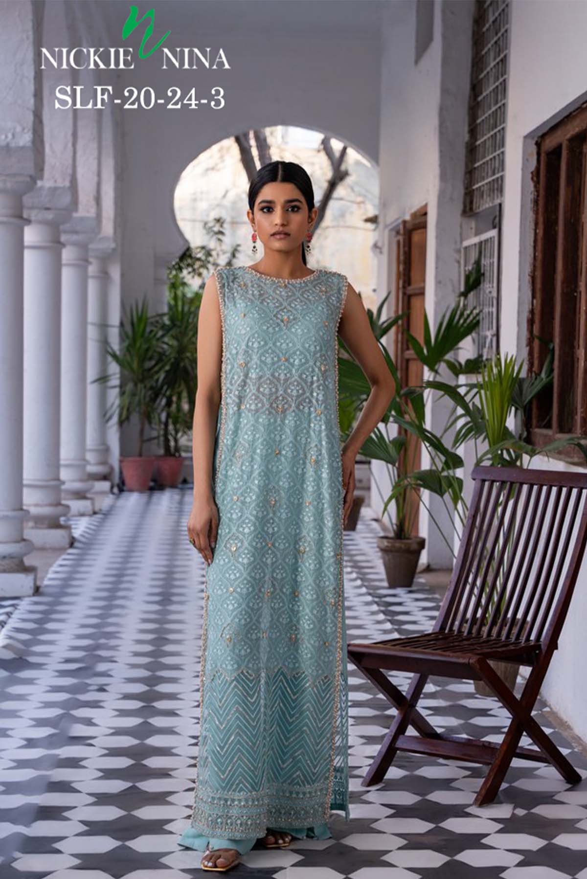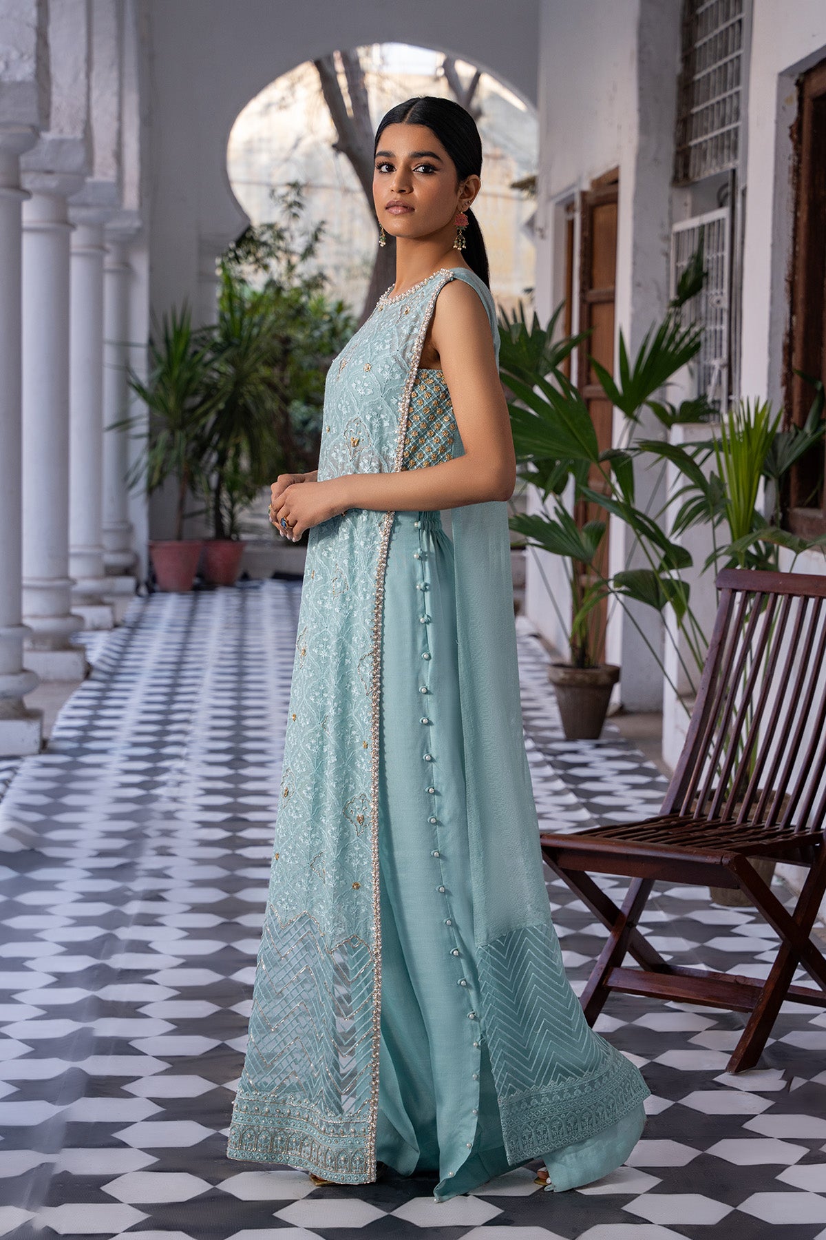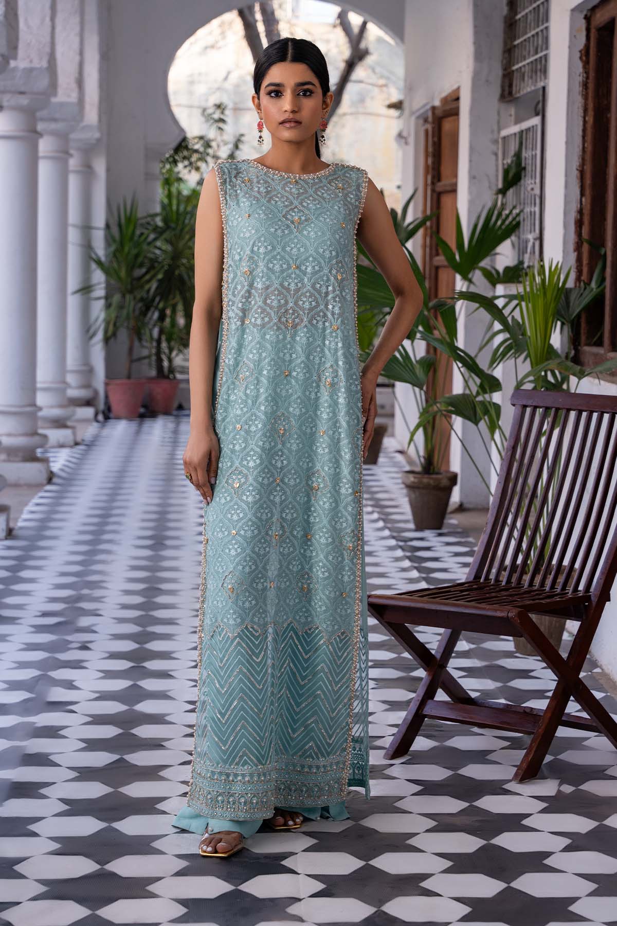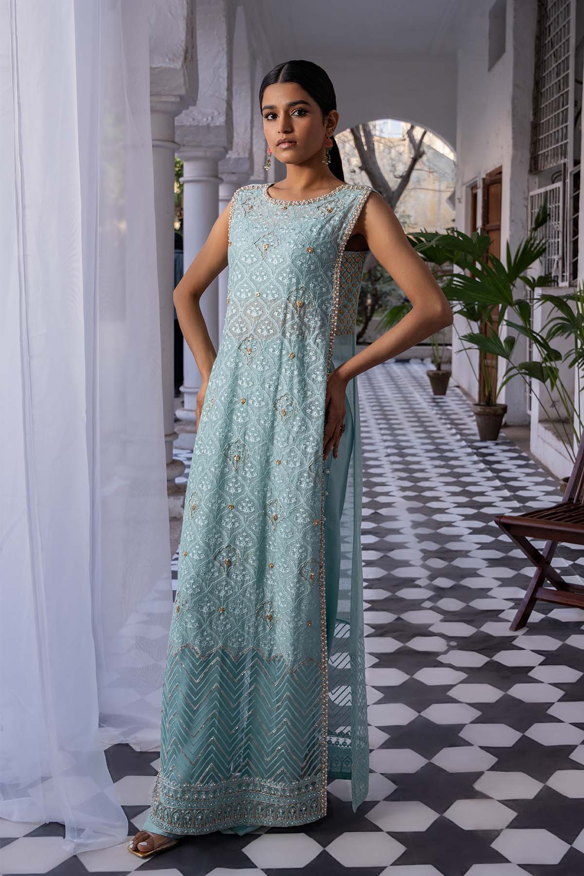 Embrace celestial elegance in this sleeveless long kameez, awash in a serene shade of blue. Delicate silver and gold embellishments, accented by a sprinkle of pearls, cascade across the fabric, casting a spell of timeless charm. Gota finishes on the side pattis of the shirt add a touch of regal allure. Paired iwth side slit pants