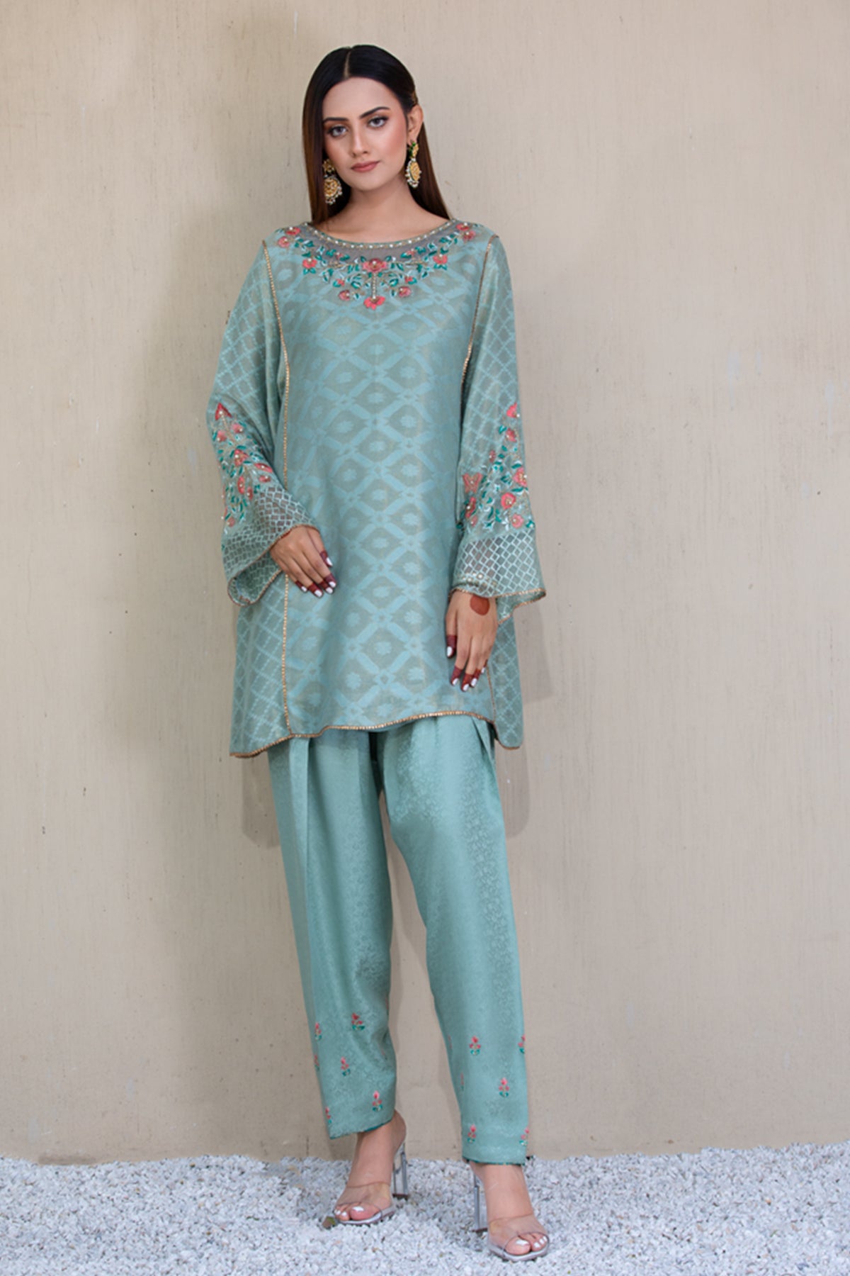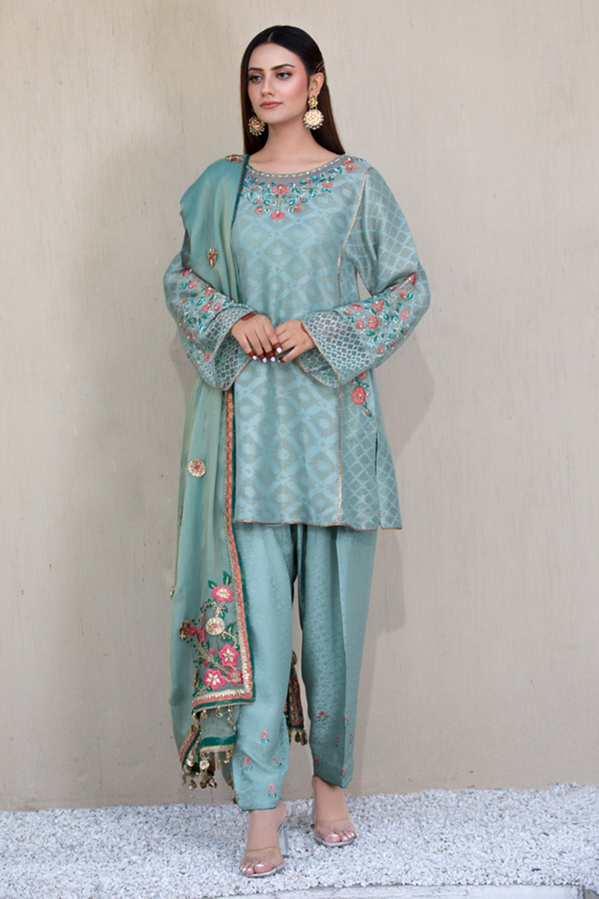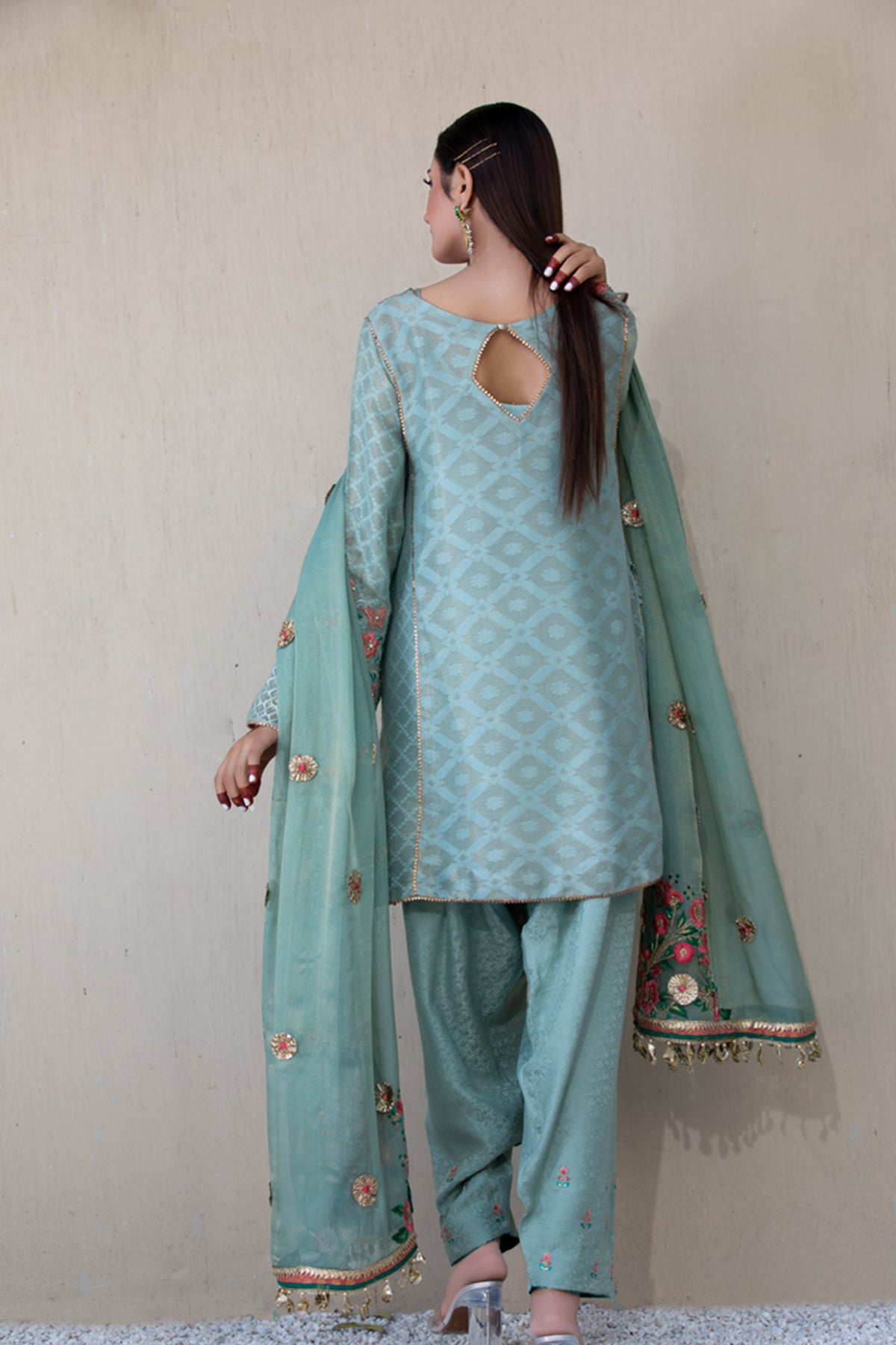 Mint Green cotton net kurta with embroidered pockets. Embossed silk gota, tilla and resham work shalwar.