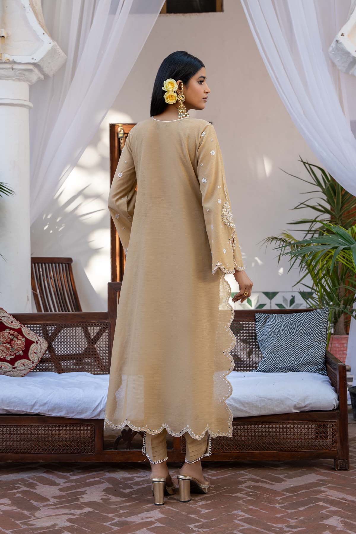 Elegance in every stitch: Adorn yourself in this exquisitely hand-embroidered silk ensemble, where intricate kasheedakari meets the subtle allure of pearls, stones, and dabka. Paired with matching silk pants